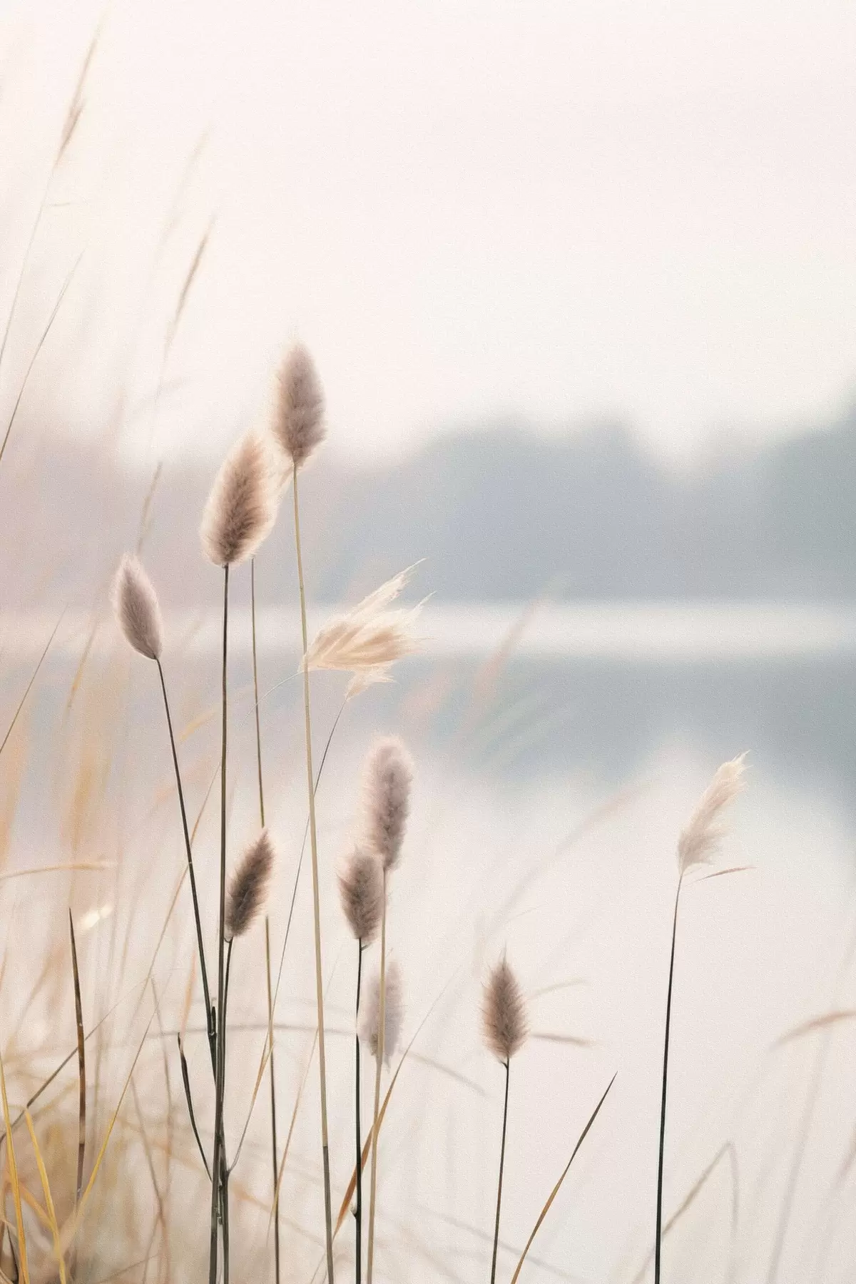 carta da parati Canneti morbidi in riva a un lago nebbioso, tonalità beige pastello nr. s46504