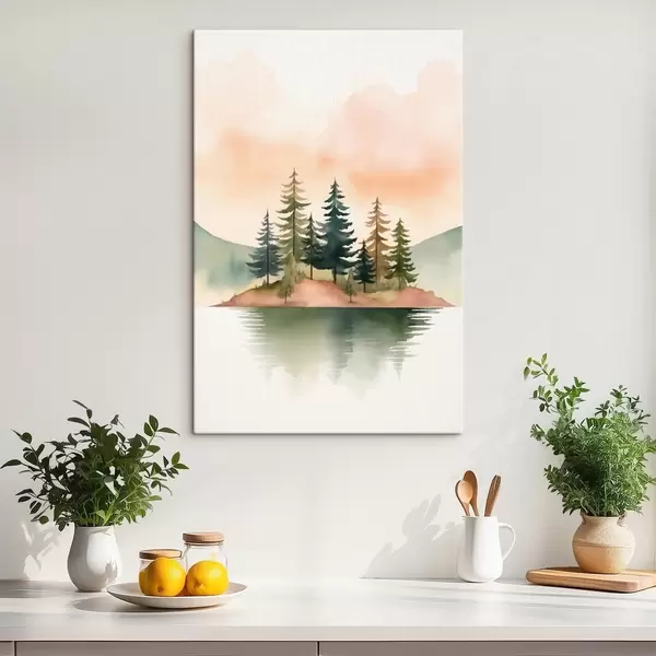 Quadri Pini acquerellati su un isolotto nebbioso, cielo color pesca tenue Nr s46505