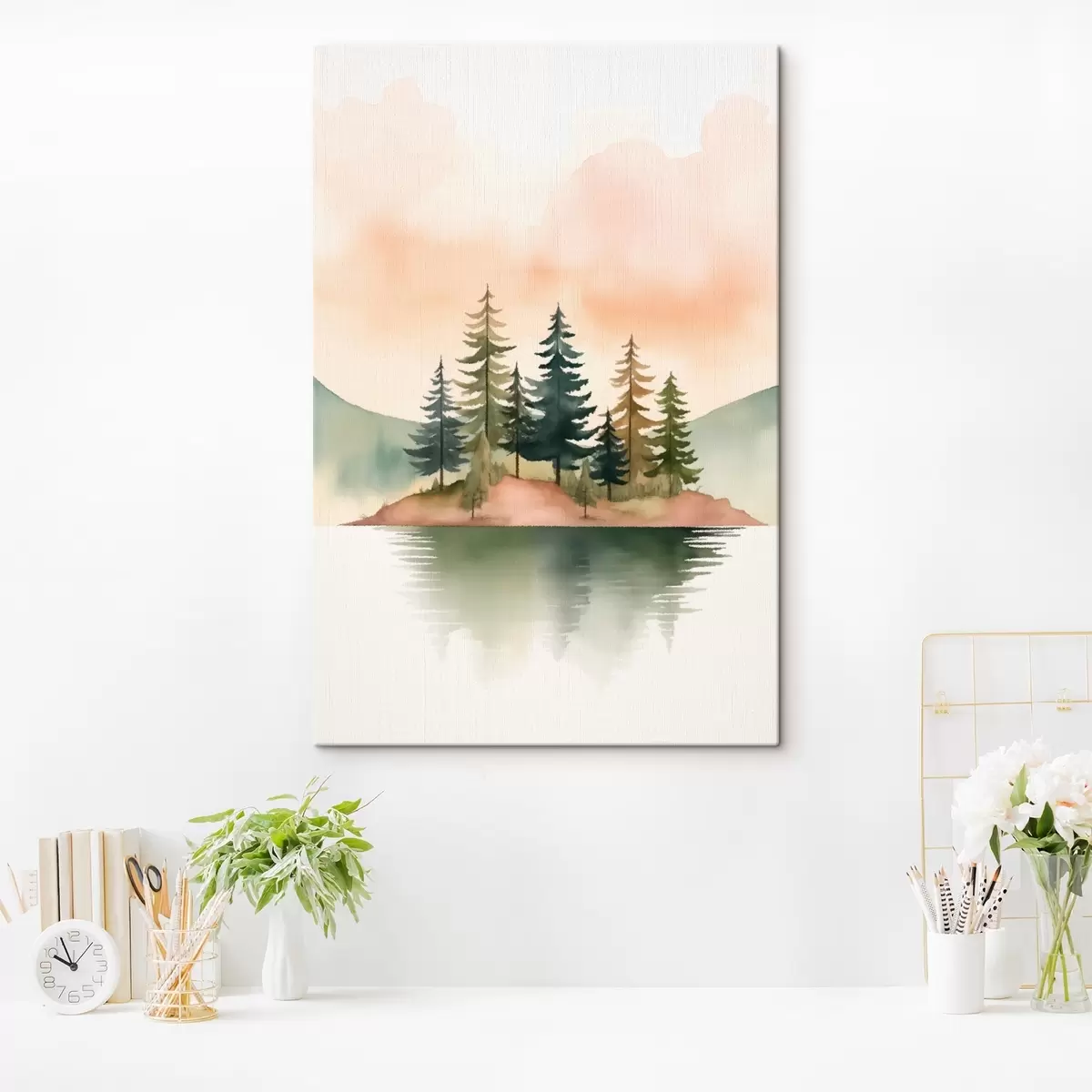 Quadri Pini acquerellati su un isolotto nebbioso, cielo color pesca tenue Nr s46505