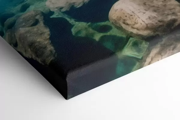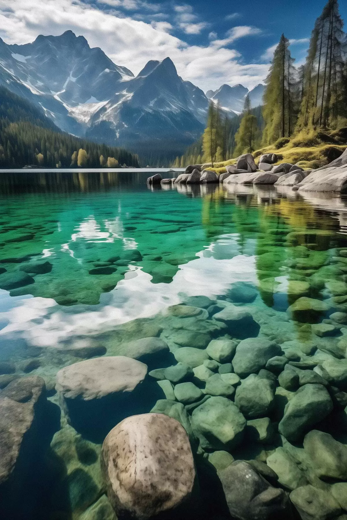 Quadri Lago alpino color smeraldo con rocce sottostanti e vette imponenti Nr s46515