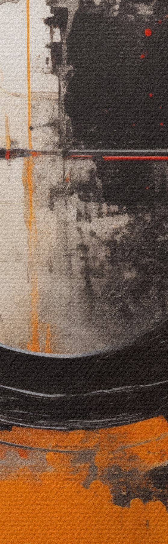 Quadri Cerchio nero su sfondo bianco, pennellate e schizzi arancioni Nr s46549