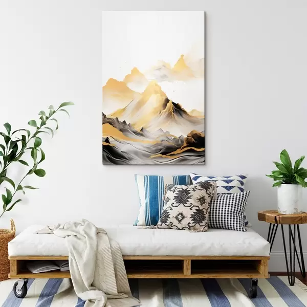 Quadri Montagne gialle e nere con cime innevate, stile pittorico a inchiostro, catena montuosa minimalista Nr s46684