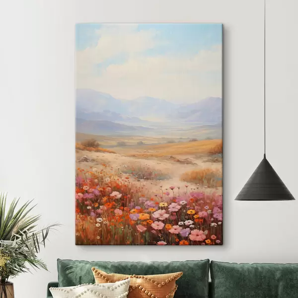 Quadri Paesaggio, un campo di fiori colorati con le montagne sullo sfondo, colori tenui e pastello Nr s46685
