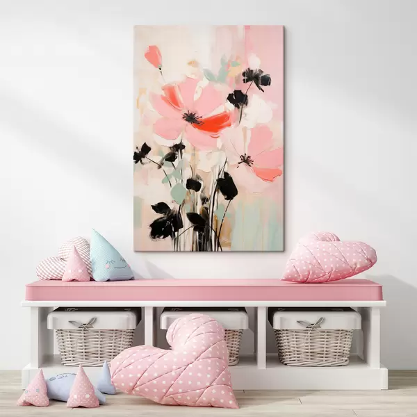 Quadri Fiori rosa e neri con foglie, colori pastello tenui, composizione floreale astratta, arte minimalista Nr s46687