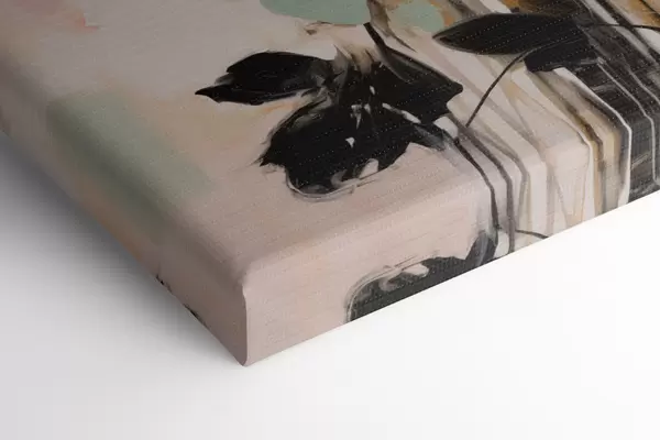 Quadri Fiori rosa e neri con foglie, colori pastello tenui, composizione floreale astratta, arte minimalista Nr s46687