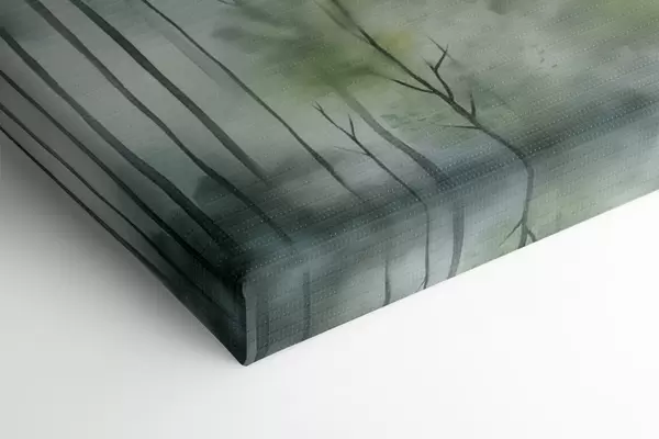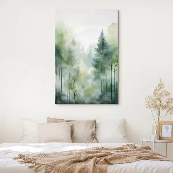 Quadri Imitazione di un dipinto ad acquerello raffigurante una foresta nebbiosa con alti pini e montagne sullo sfondo Nr s46690