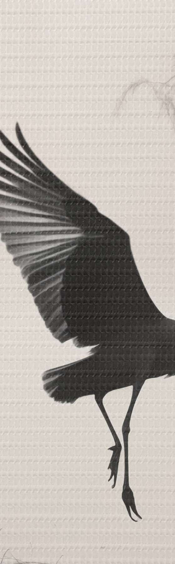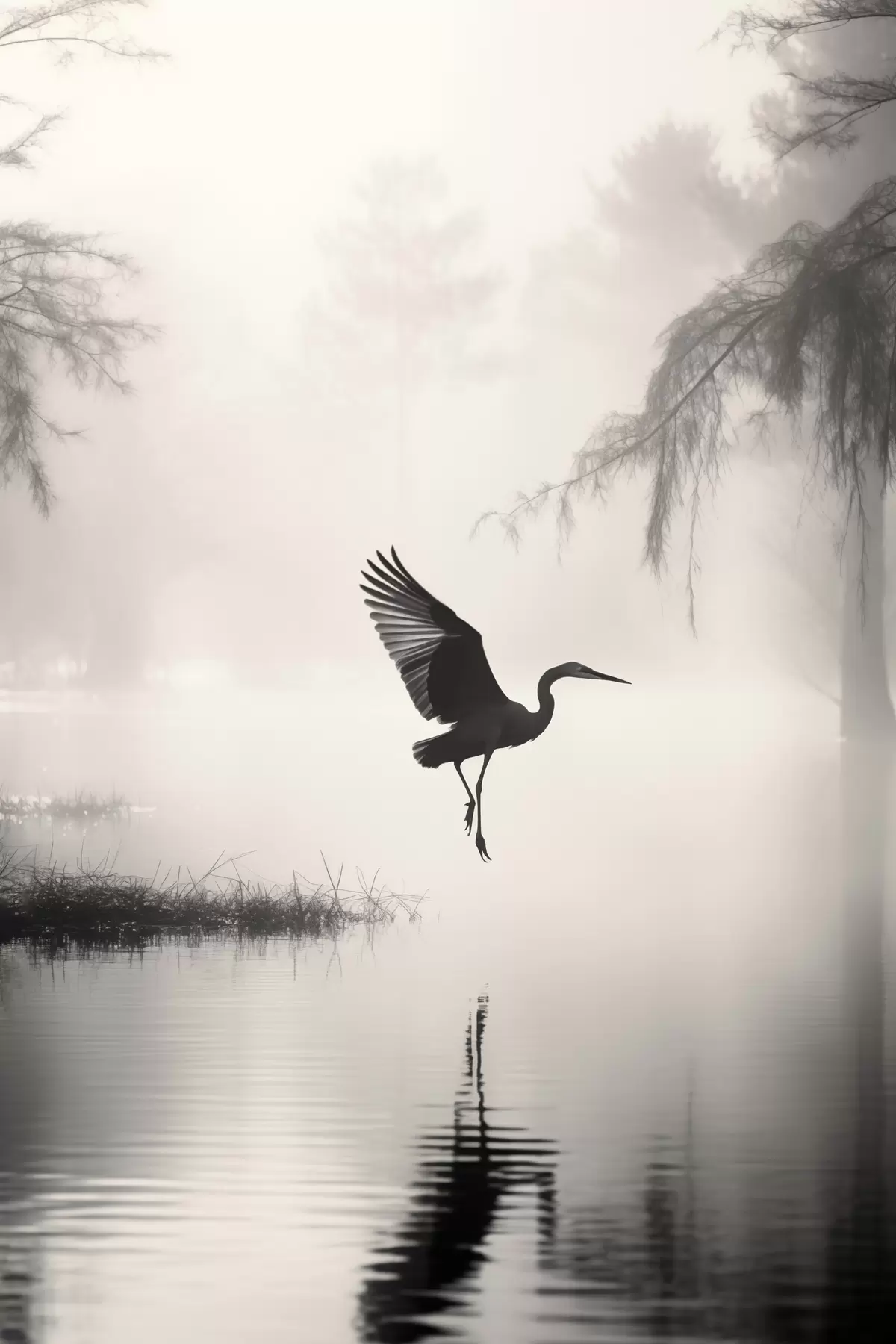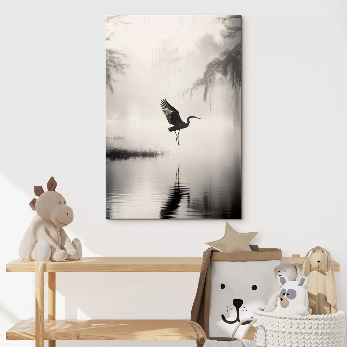 Quadri Un airone bianco con le ali spiegate, che vola vicino ad alte canne, composizione minimalista in bianco e nero Nr s46694