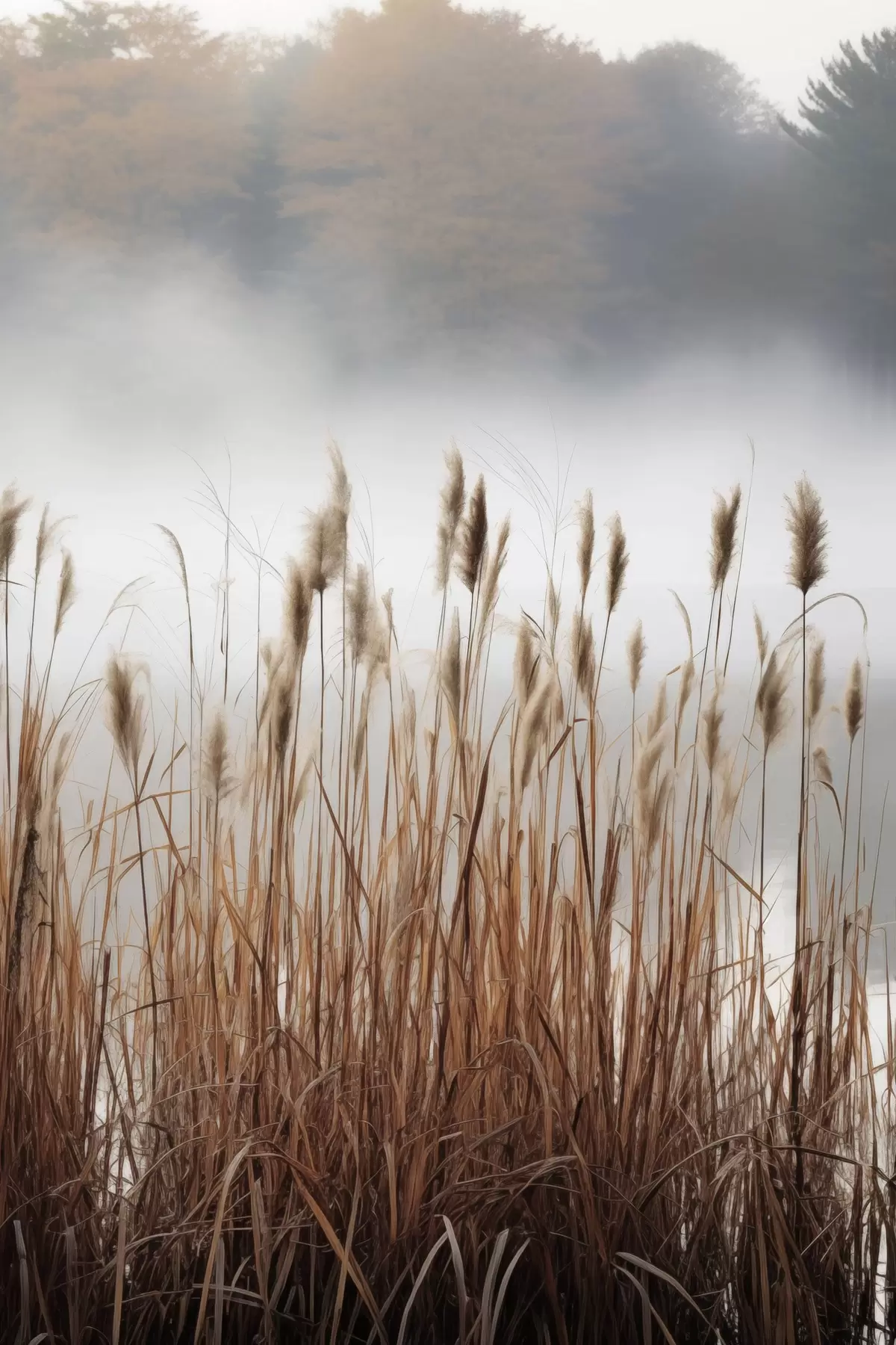 carta da parati Alte canne che crescono in uno specchio d'acqua, l'acqua riflette le canne, sfondo nebbioso, luce soffusa, scena naturale nr. s46696