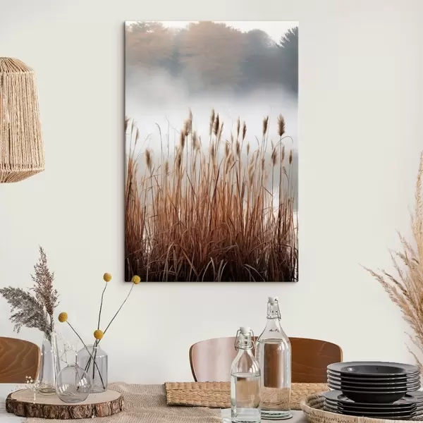 Quadri Alte canne che crescono in uno specchio d'acqua, l'acqua riflette le canne, sfondo nebbioso, luce soffusa, scena naturale Nr s46696
