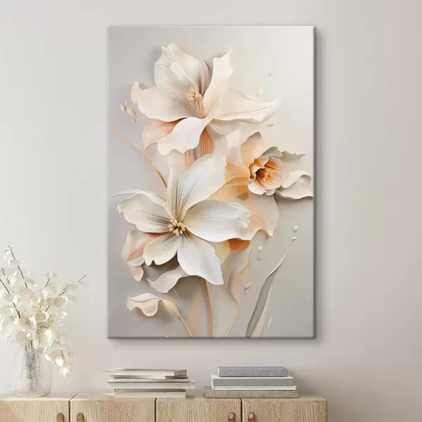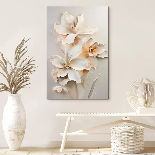 Quadri Fiori bianchi, petali con ombre delicate, sfondo beige chiaro, composizione elegante, stile minimalista Nr s46699