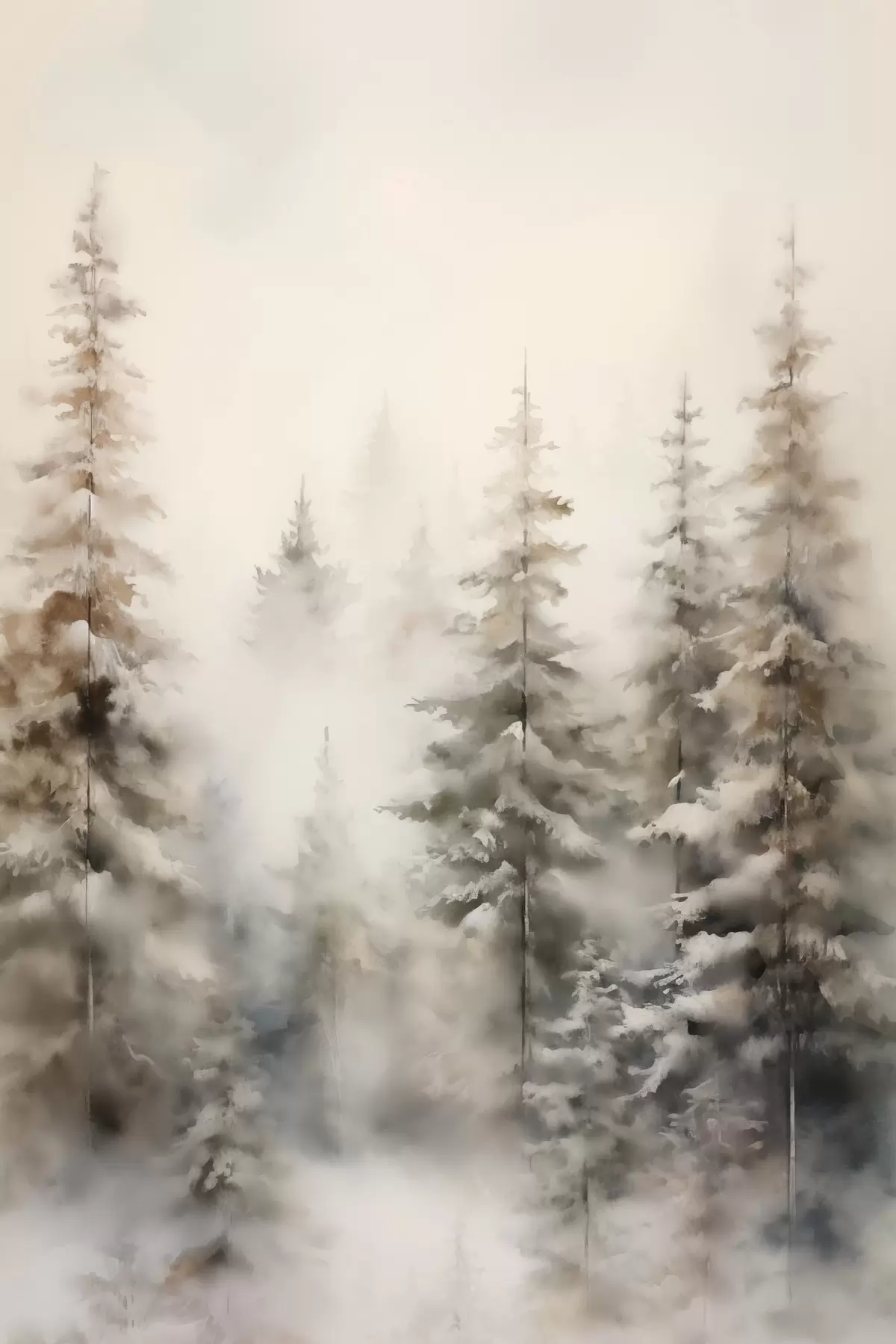 carta da parati Alti pini ricoperti di neve, immersi in una foresta avvolta dalla nebbia, una scena invernale morbida e ovattata. nr. s46701