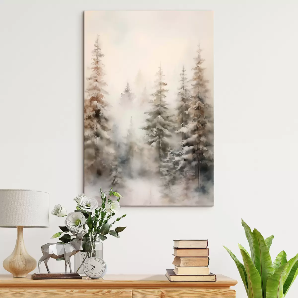 Quadri Alti pini ricoperti di neve, immersi in una foresta avvolta dalla nebbia, una scena invernale morbida e ovattata. Nr s46701