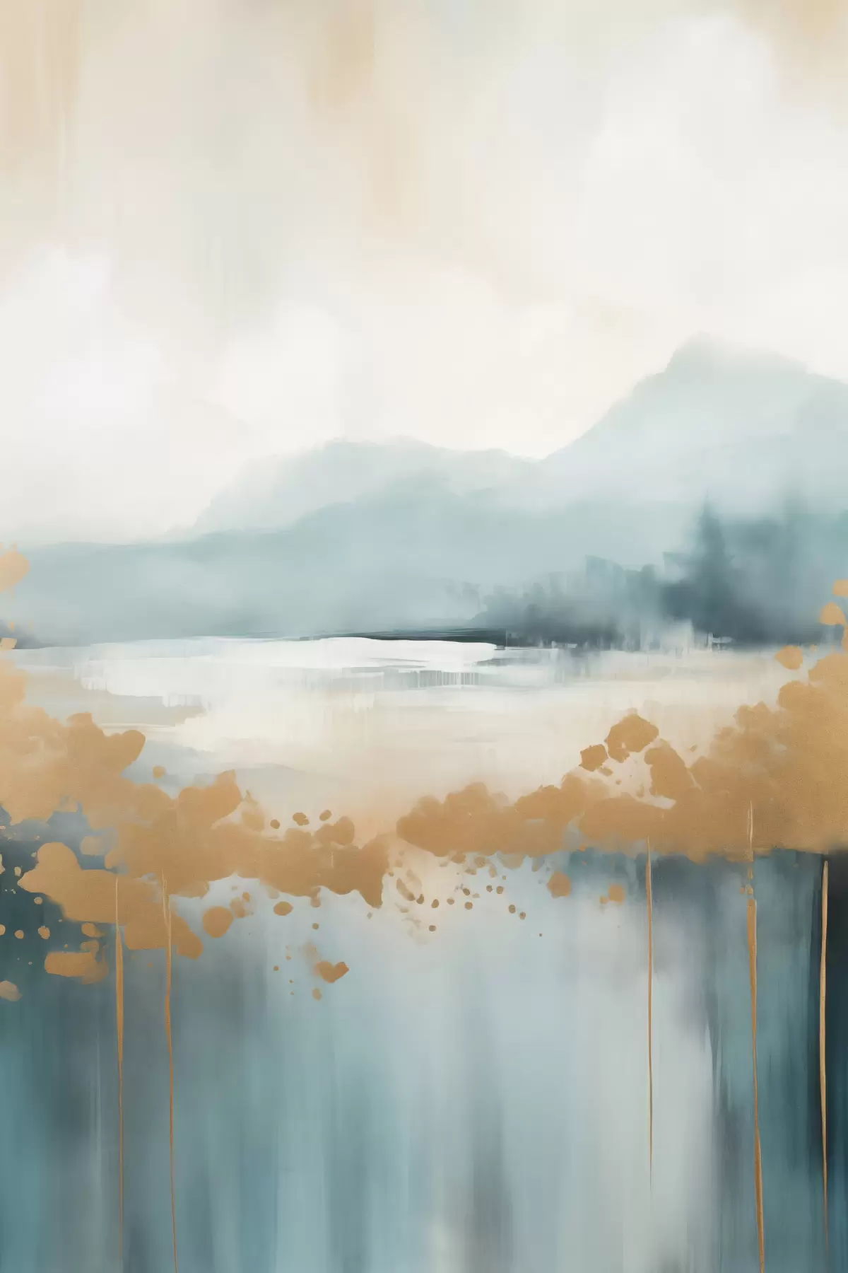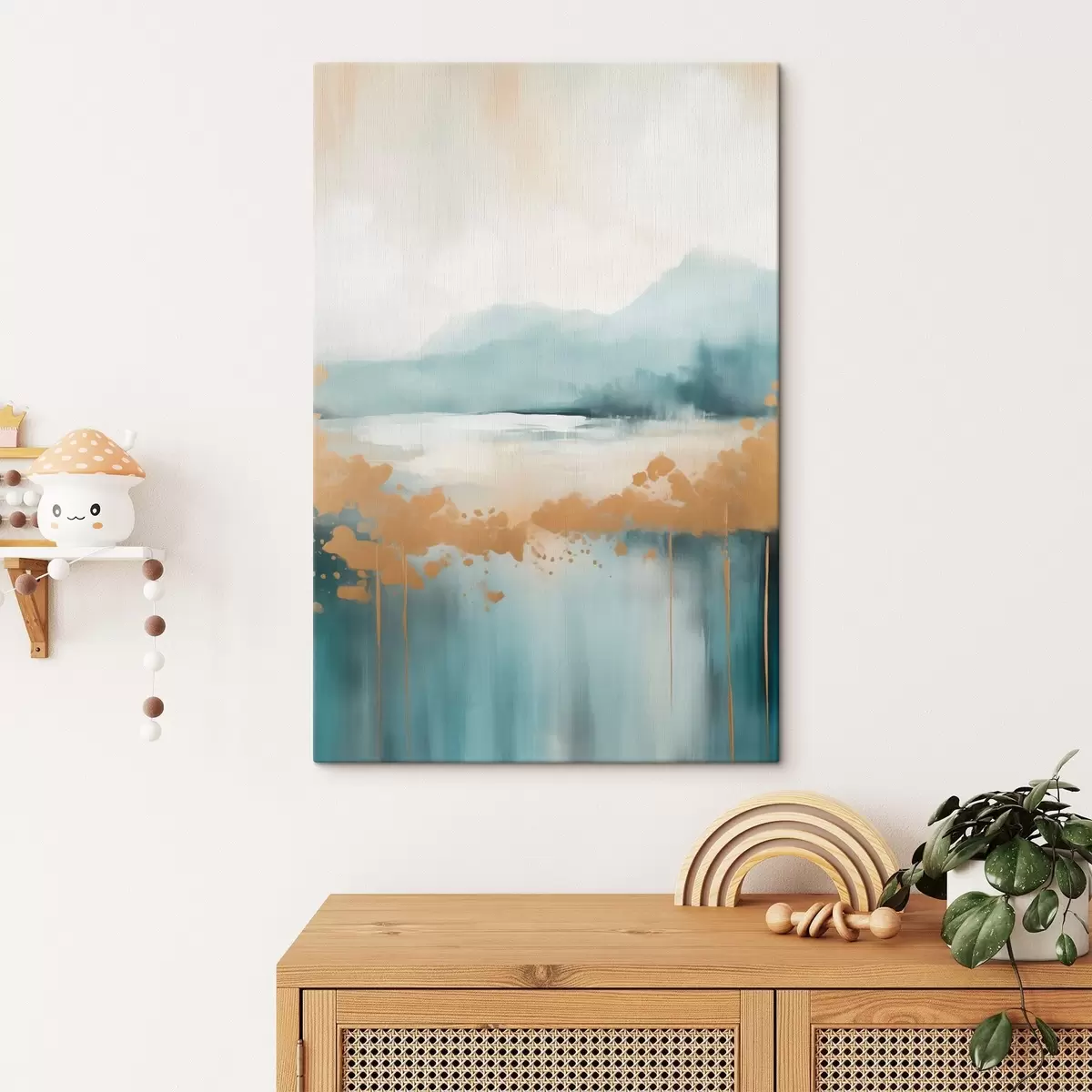 carta da parati Paesaggio astratto con montagne e lago in verde acqua e giallo materico, pennellate morbide, opera d'arte minimalista nr. s46703