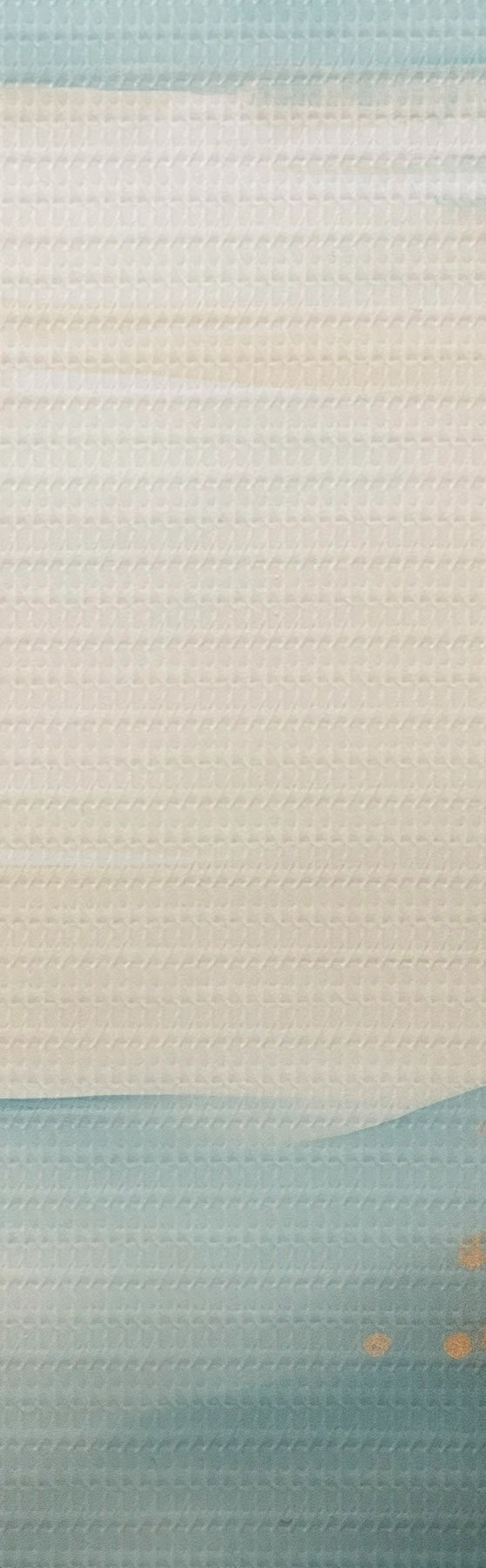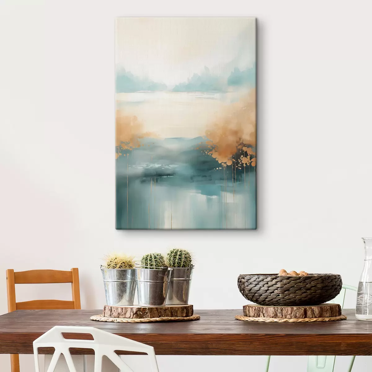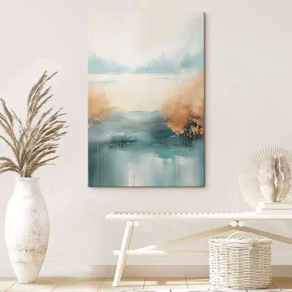 carta da parati Paesaggio astratto con montagne e lago in verde acqua e giallo materico, pennellate morbide, opera d'arte minimalista nr. s46704