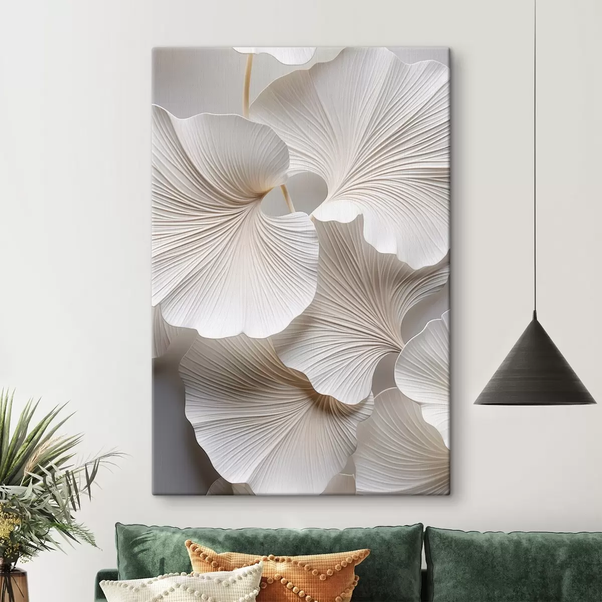 Quadri Foglie bianche di ginkgo biloba con venature dettagliate, illuminazione soffusa, design elegante e minimalista con texture Nr s46705