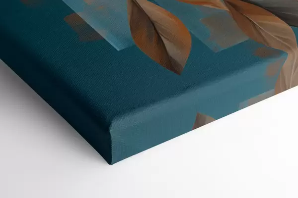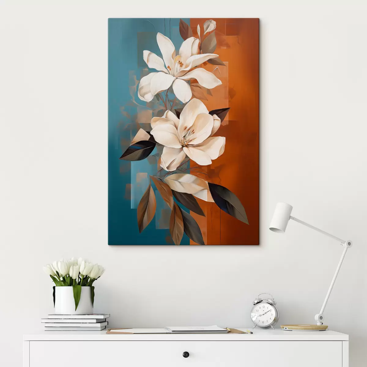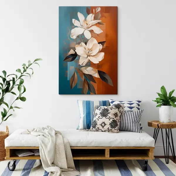 Quadri Fiori e foglie bianchi astratti su sfondo marrone e blu con forme astratte, in stile minimalista Nr s46710