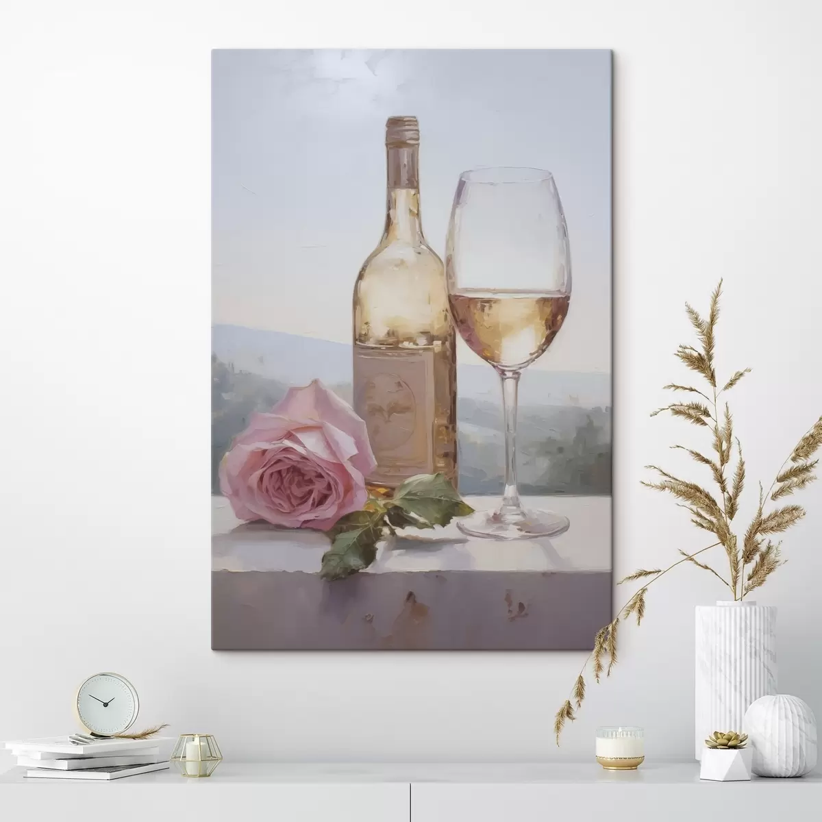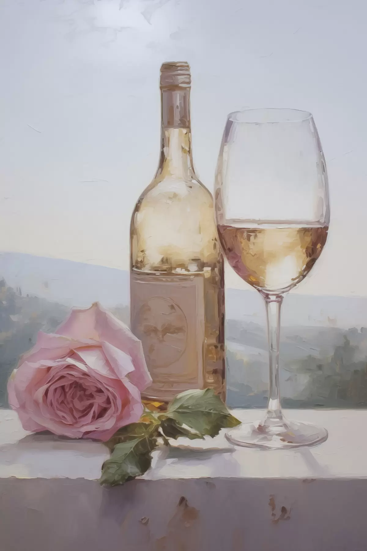Quadri Una bottiglia e un bicchiere di vino e un cagnolino con gli occhiali, dipinto imitazione Nr s46721