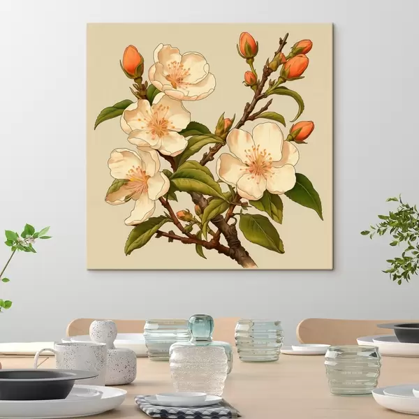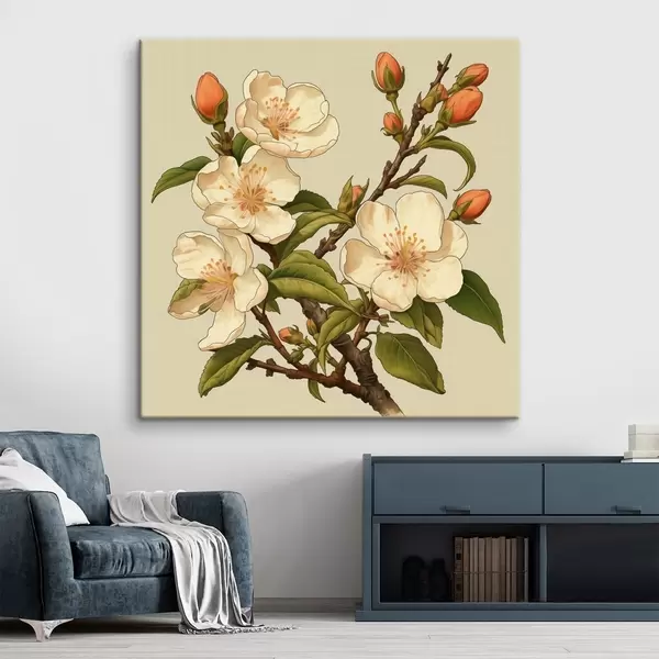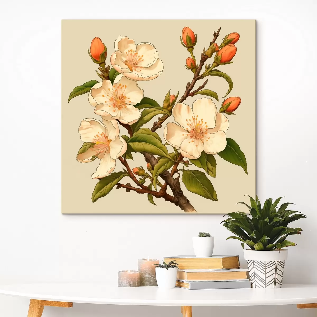 Quadri Ramo fiorito con fiori bianchi su sfondo beige nello stile dell'illustrazione classica Nr s46923
