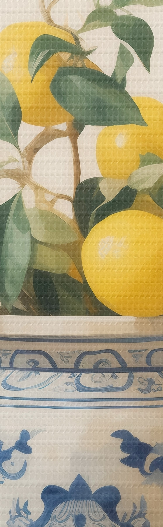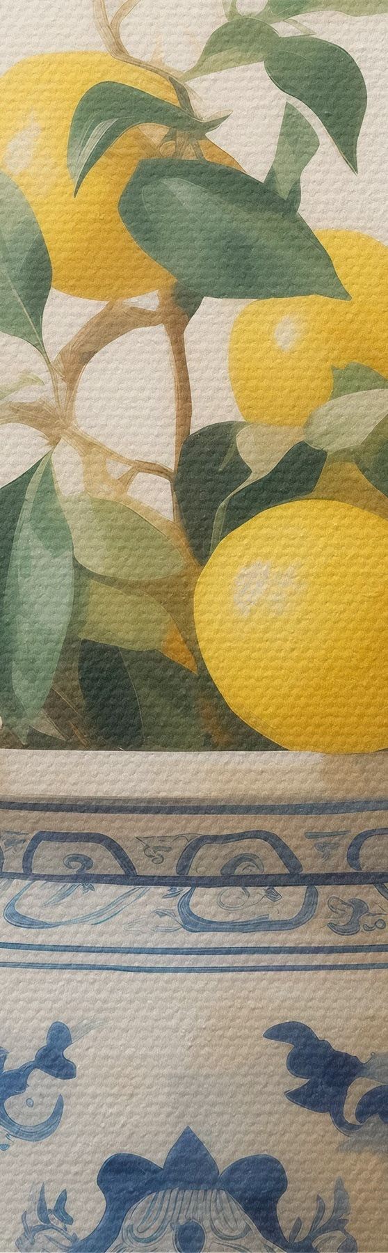 carta da parati Limoni in un vaso di ceramica blu e bianco in stile pittura a olio nr. s46924