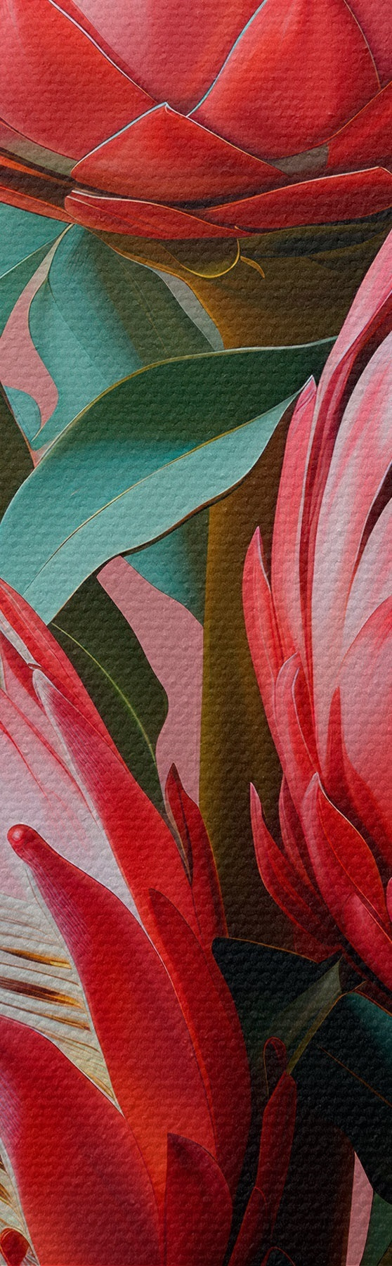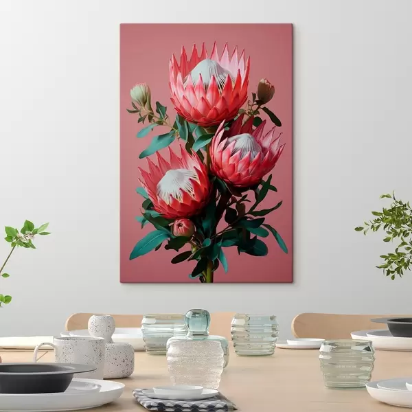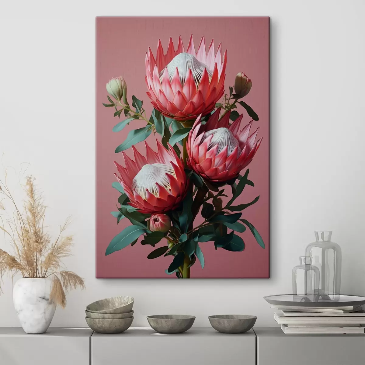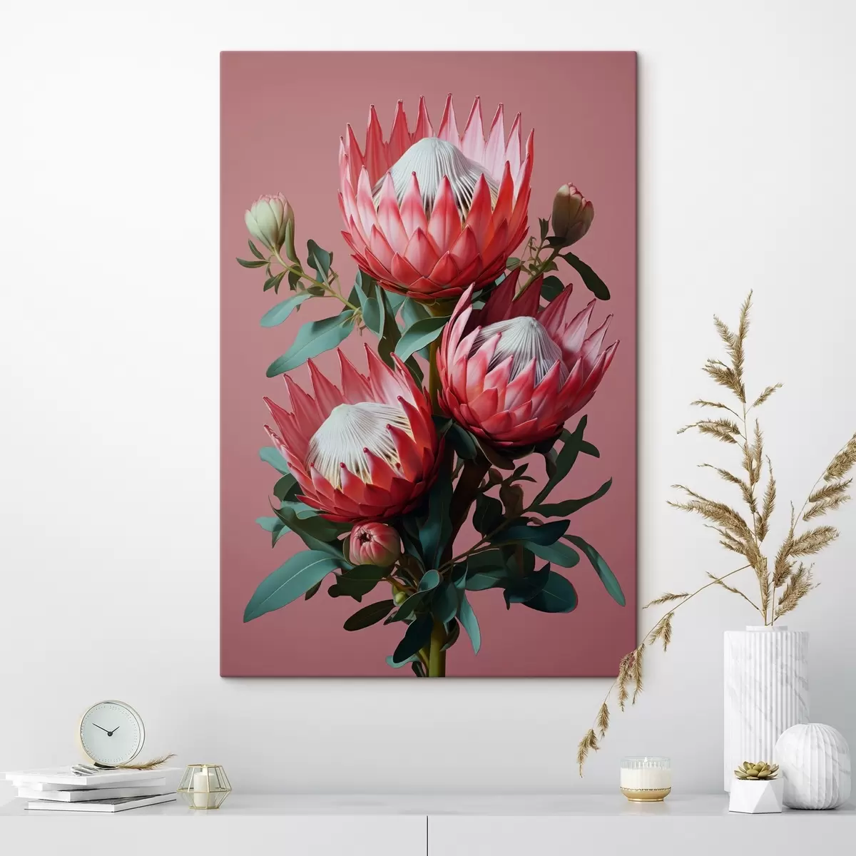 Quadri Bouquet di protea con petali rossi e fogliame verde su sfondo rosa Nr s46946