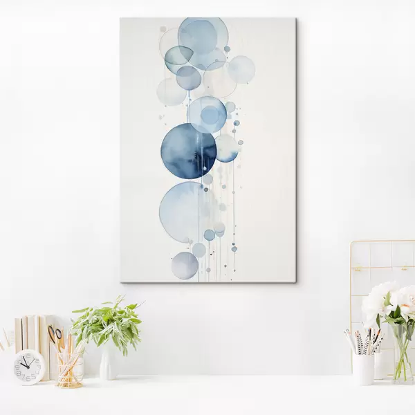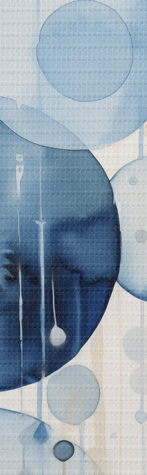 Quadri Testo astratto con cerchi acquerellati blu e bianchi di varie dimensioni, su sfondo bianco Nr s47021