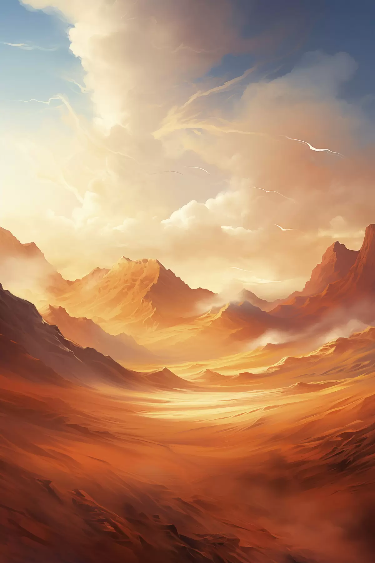 carta da parati Un vasto paesaggio desertico arancione con imponenti montagne rocciose sotto un cielo nebbioso e soleggiato con nuvole sottili. nr. s47028