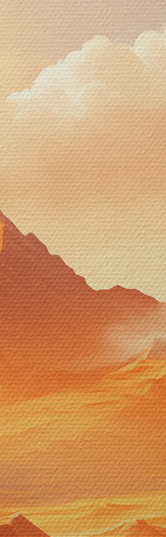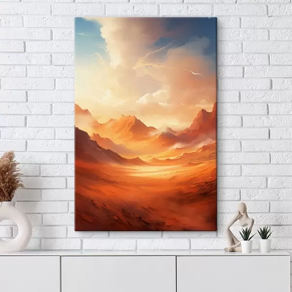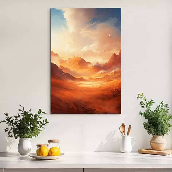 Quadri Un vasto paesaggio desertico arancione con imponenti montagne rocciose sotto un cielo nebbioso e soleggiato con nuvole sottili. Nr s47028