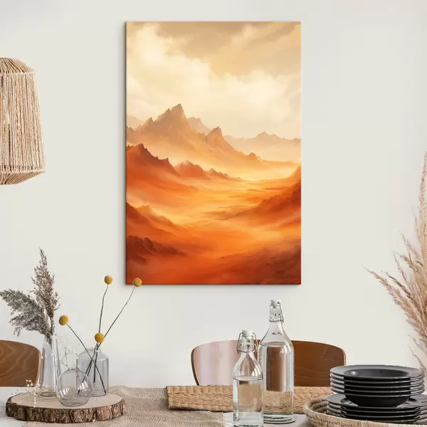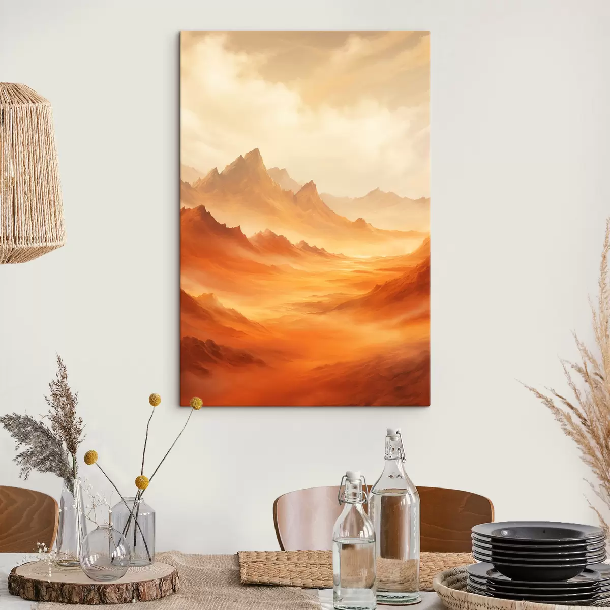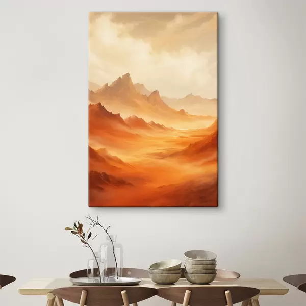 Quadri Un vasto paesaggio desertico arancione con imponenti montagne rocciose sotto un cielo nebbioso e soleggiato con nuvole sottili. Nr s47029
