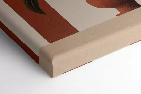 Quadri Pianta in vaso astratta con grandi foglie verdi e beige davanti a un arco color crema con un accento terracotta Nr s47032