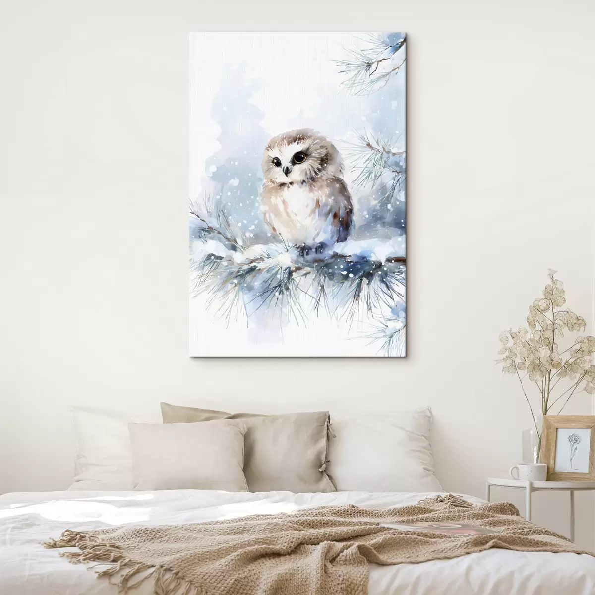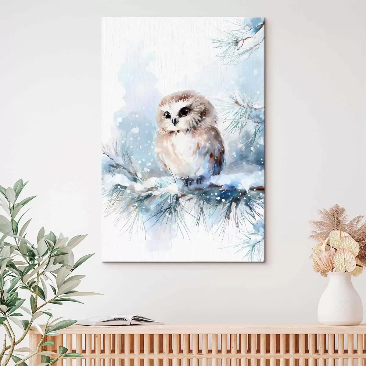 Quadri simpatico gufo su un ramo di pino innevato in stile acquerello Nr s47115
