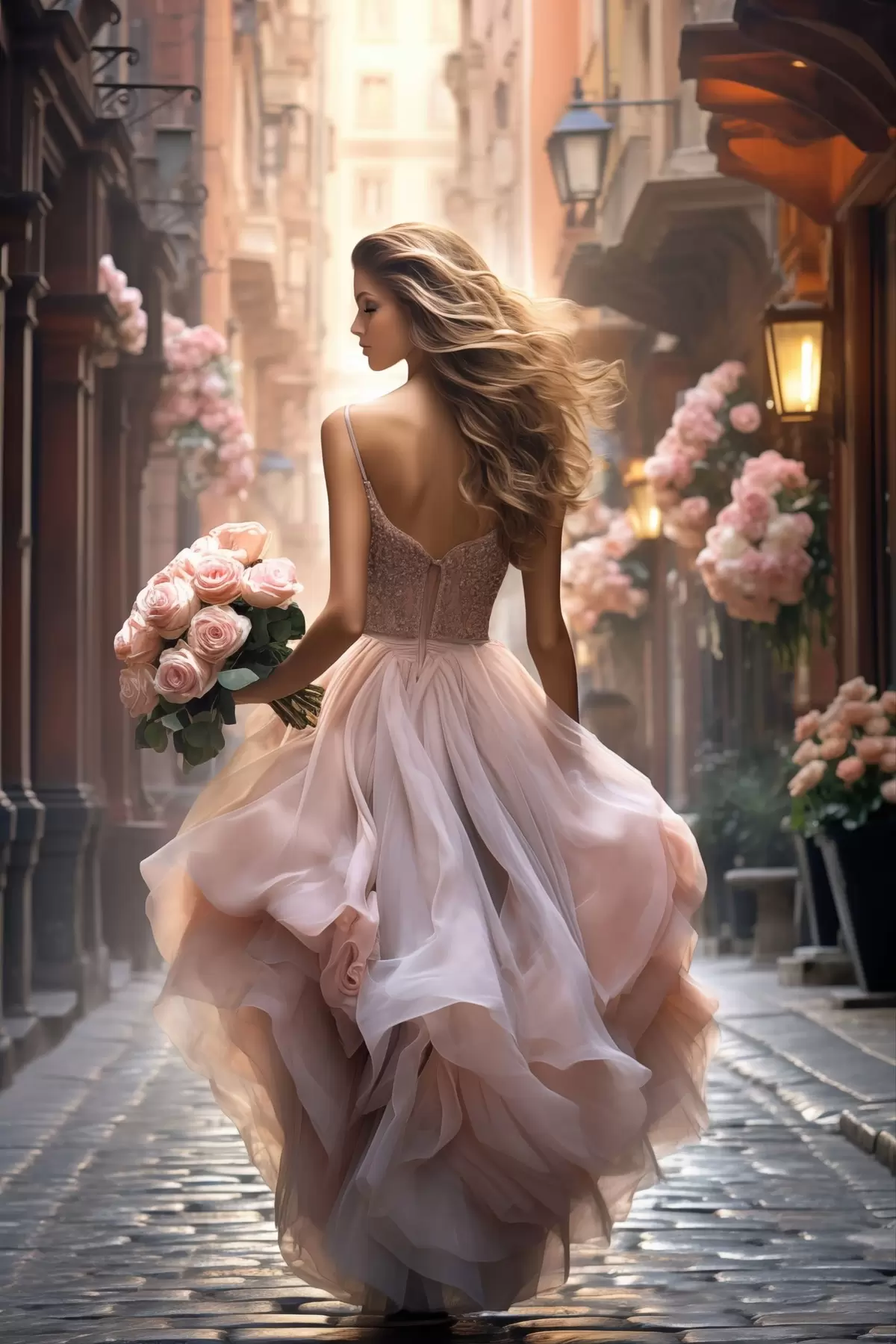carta da parati Donna in abito rosa che cammina per strada nr. s47316