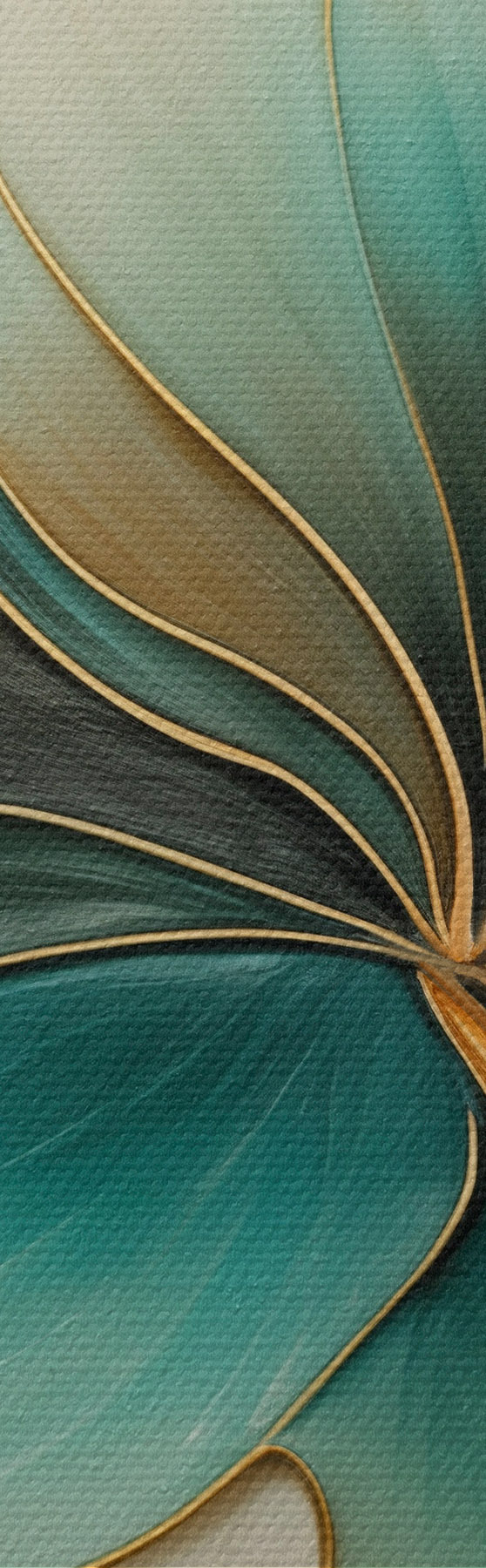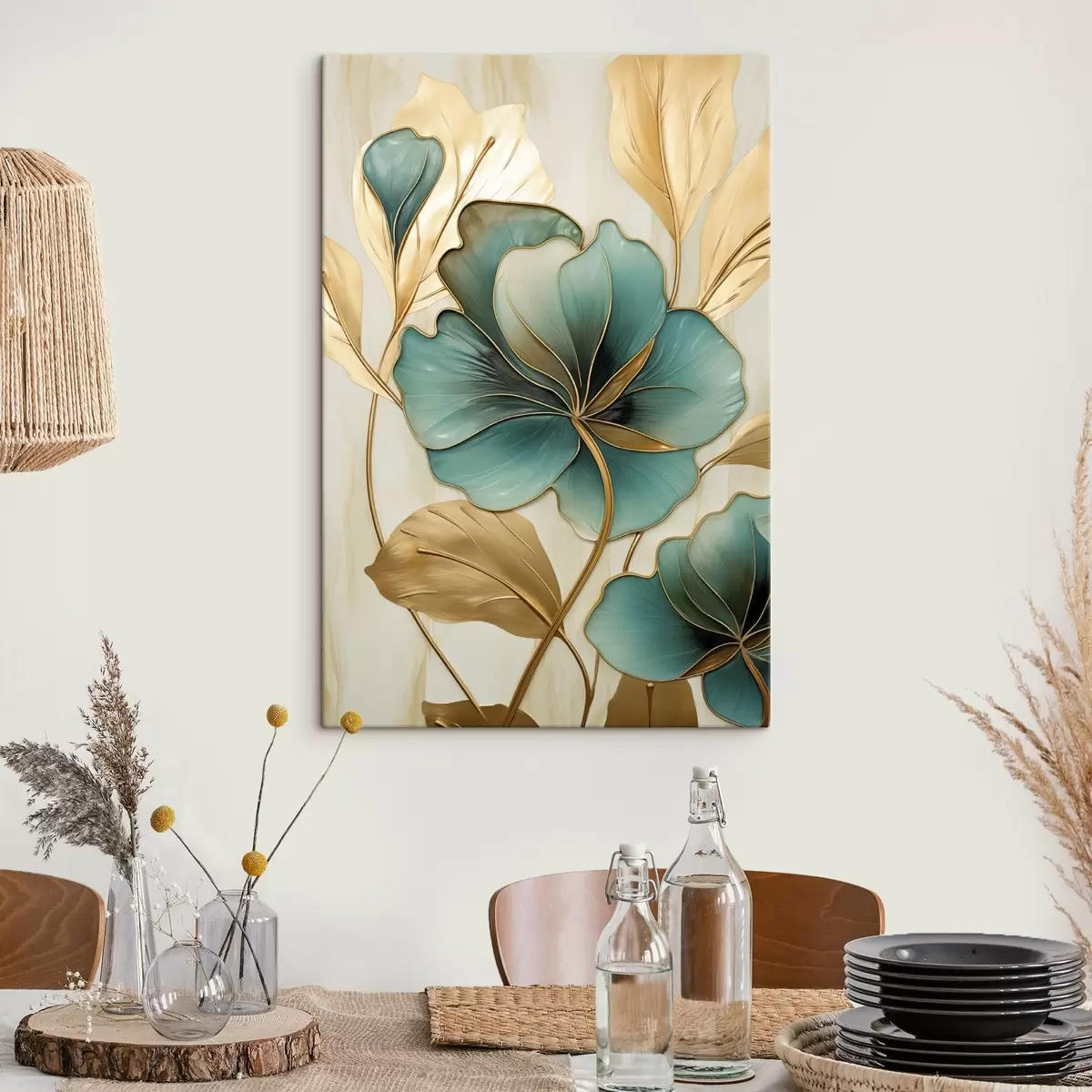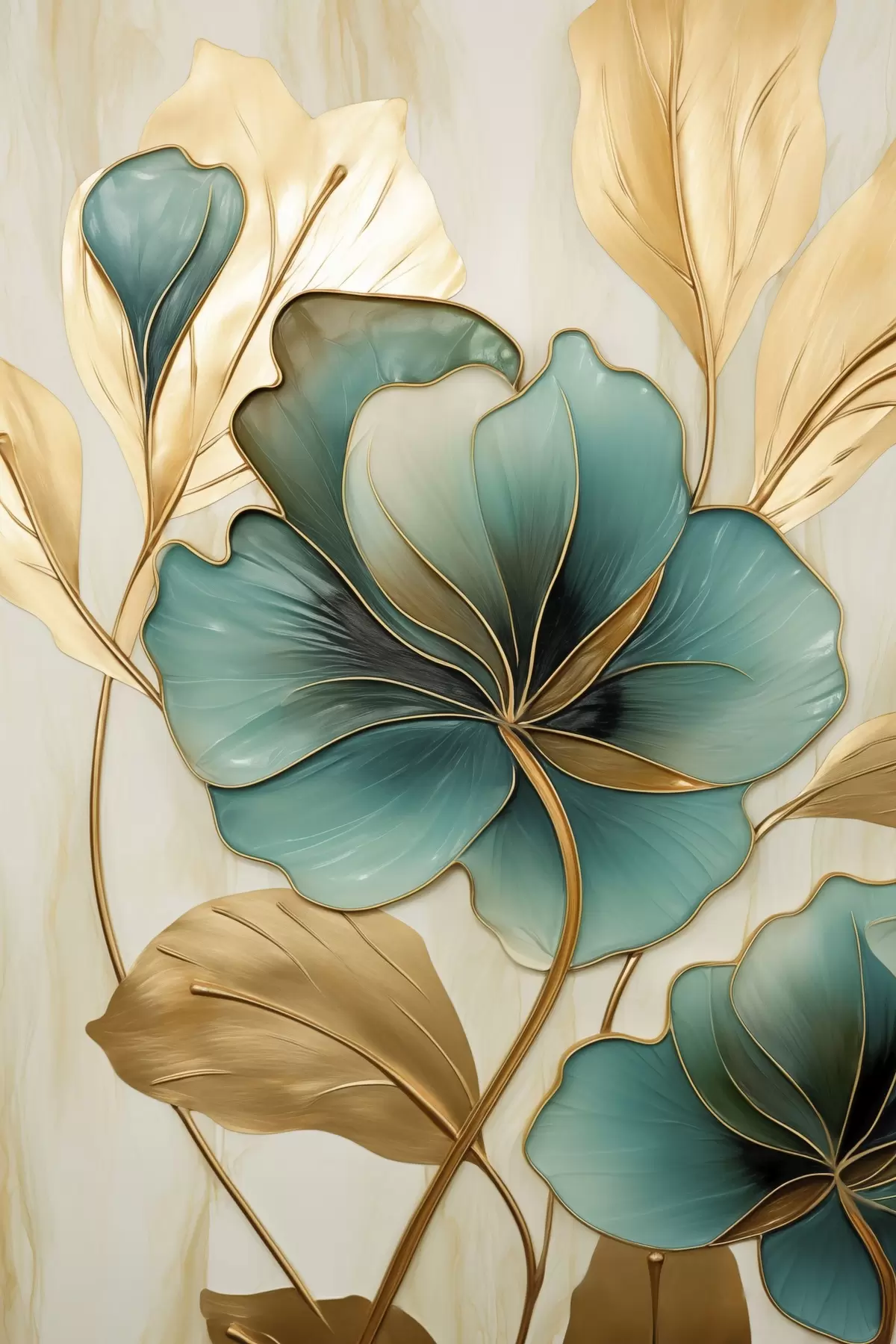 Quadri Grandi fiori verde acqua e gialli con contorni, circondati da foglie gialle su sfondo astratto Nr s47419