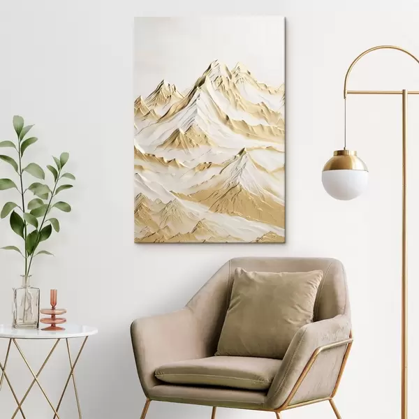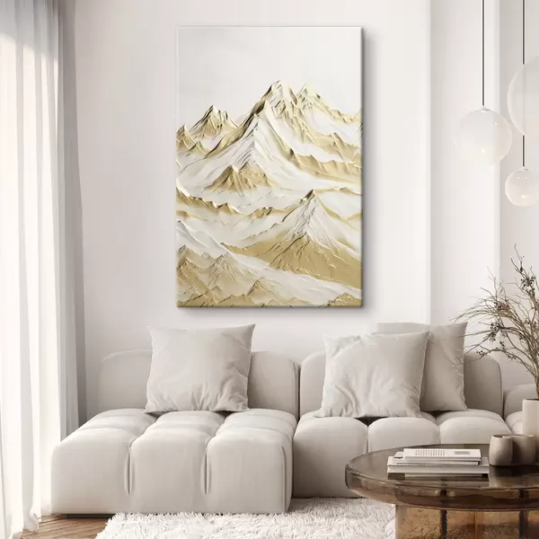 Quadri Un paesaggio di montagne innevate di colore giallo con cime aguzze e valli profonde sotto un cielo luminoso Nr s47420