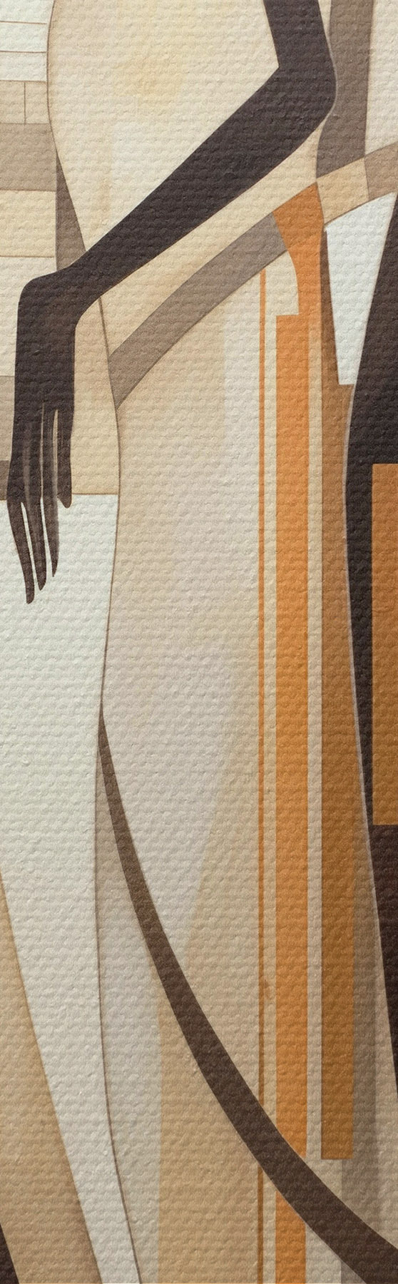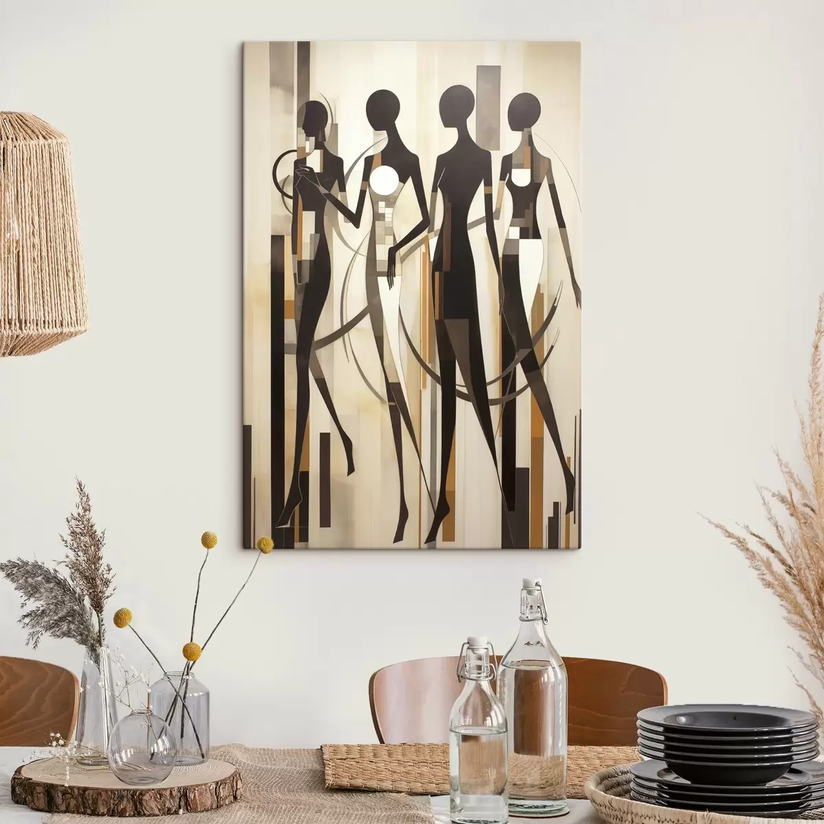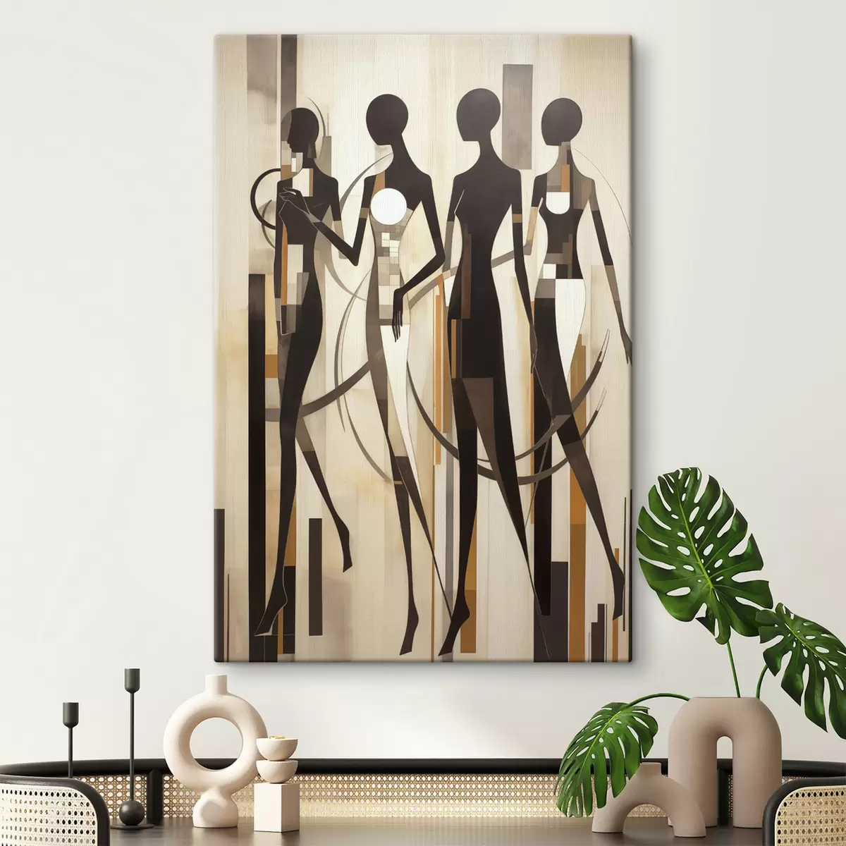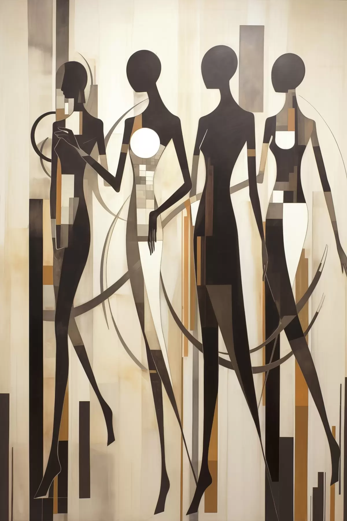 Quadri Figure femminili stilizzate con elementi geometrici su uno sfondo astratto di linee verticali Nr s47423