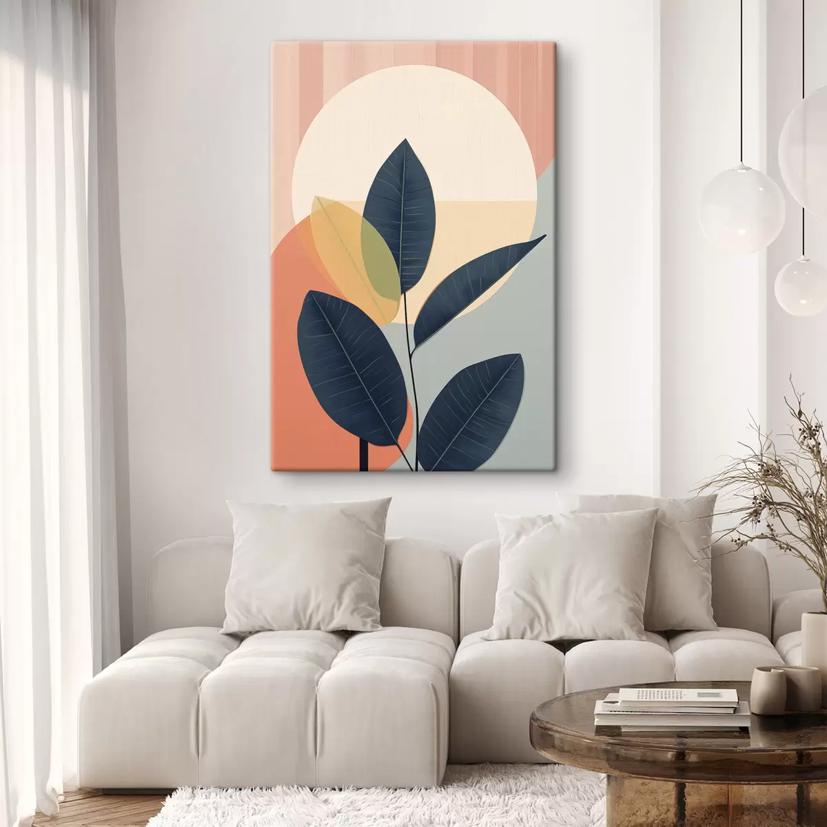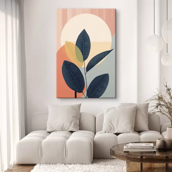 Quadri Foglie scure su uno sfondo di forme astratte color pesca e grigio con un grande cerchio giallo pallido Nr s47424