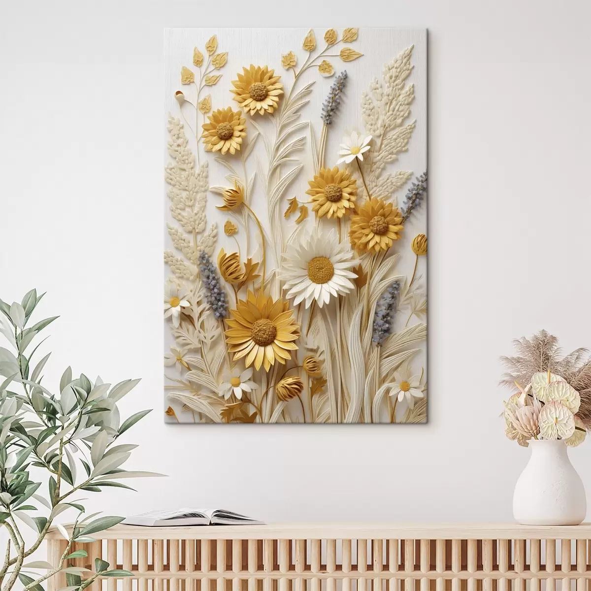 Quadri Una collezione materica di margherite gialle e bianche con erbe secche e rametti di lavanda su sfondo bianco Nr s47430