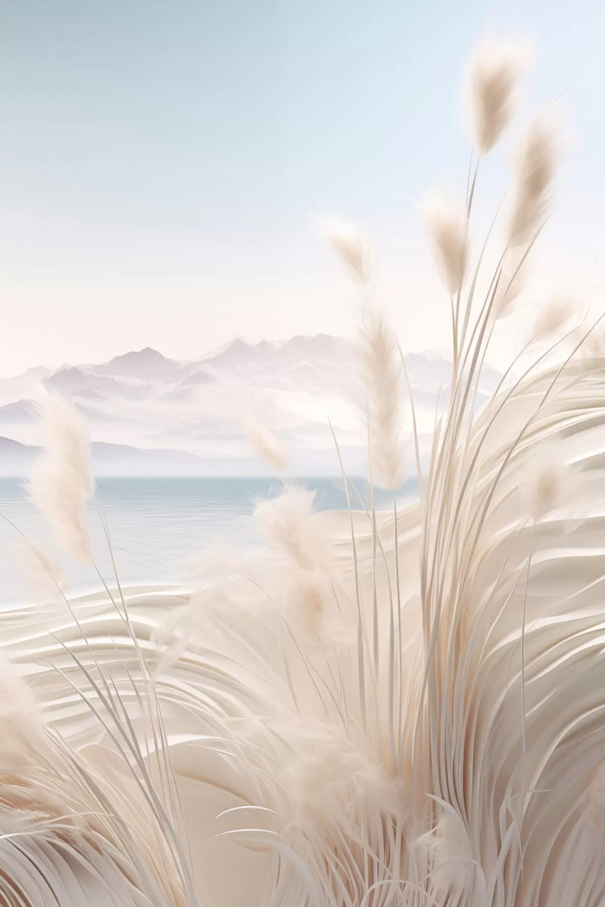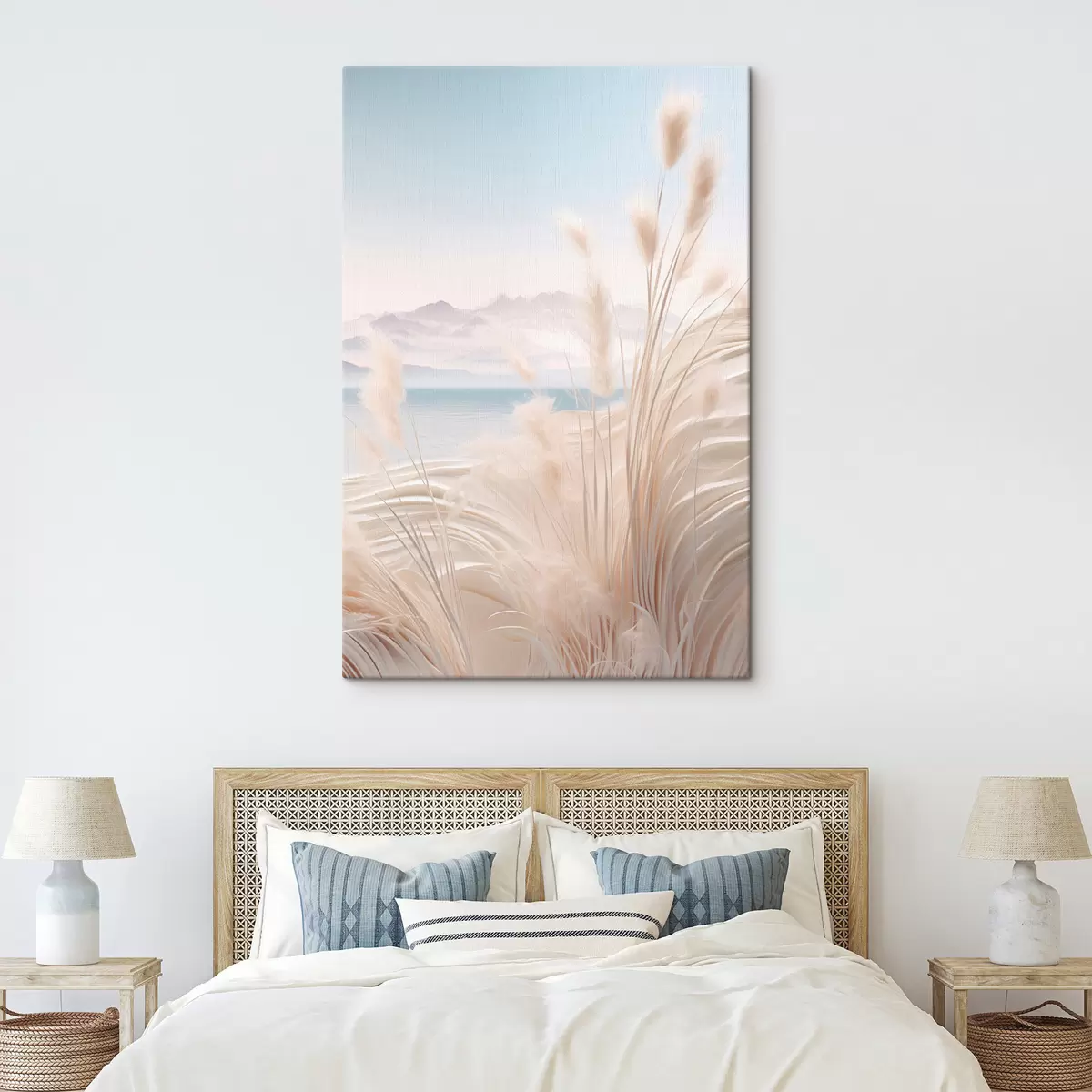 Quadri Alta erba della pampa soffice nei toni del beige, con una spiaggia sabbiosa e montagne sullo sfondo Nr s47433