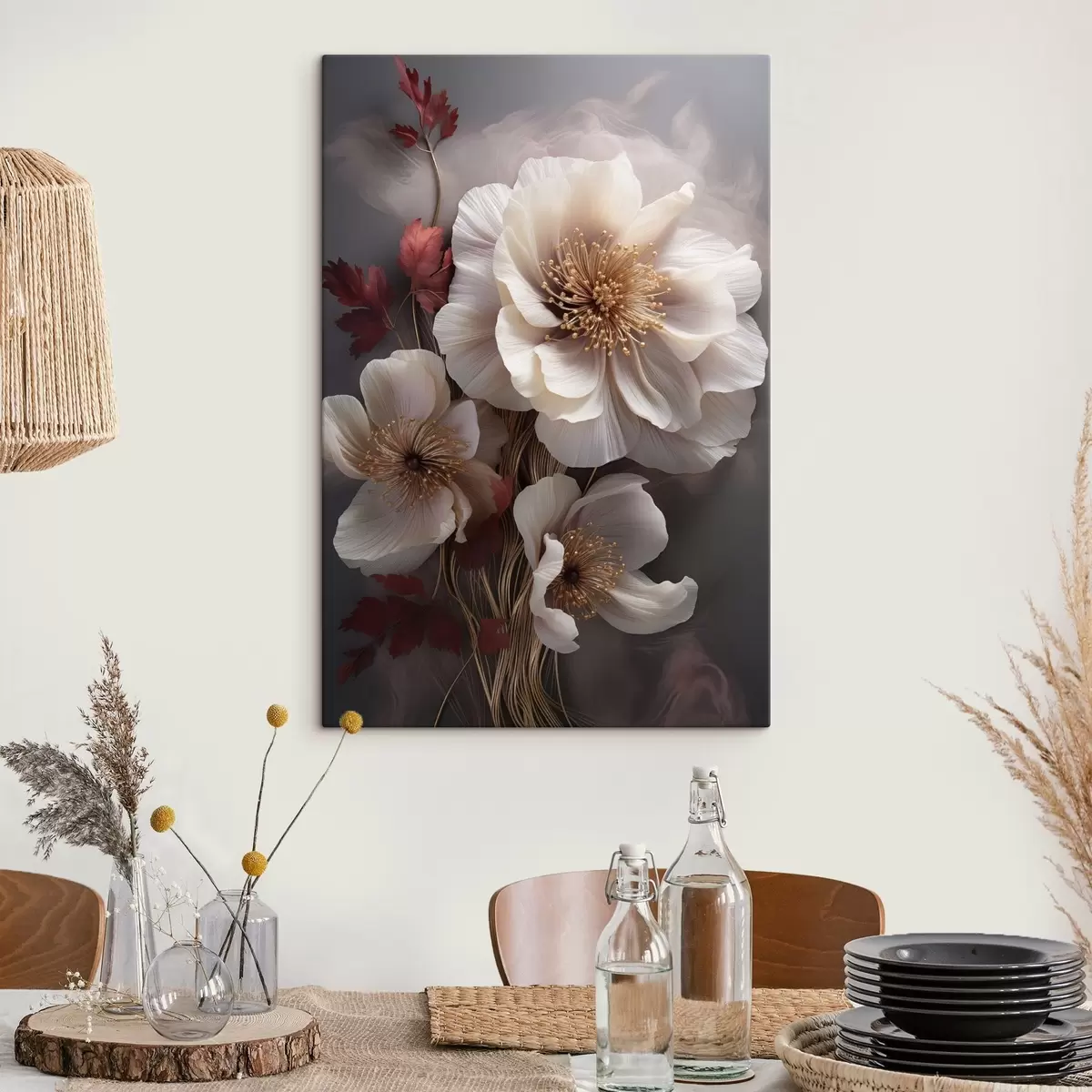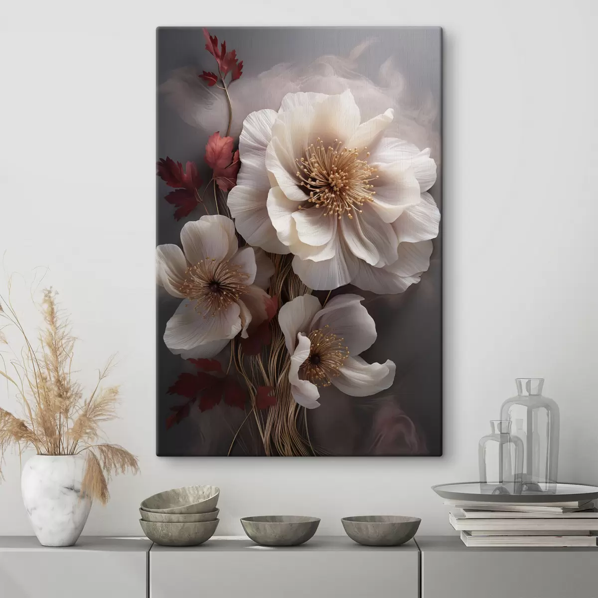 Quadri Delicate peonie dai petali sottili e vaporosi, circondate da foglie rosso scuro su uno sfondo astratto Nr s47434