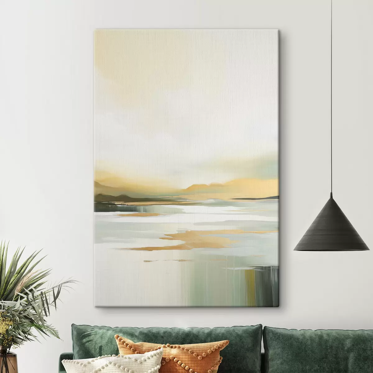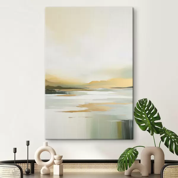 Quadri Paesaggio astratto con tonalità gialle e verdi, acqua che riflette il cielo e le montagne lontane, cielo pallido e nebbioso Nr s47439