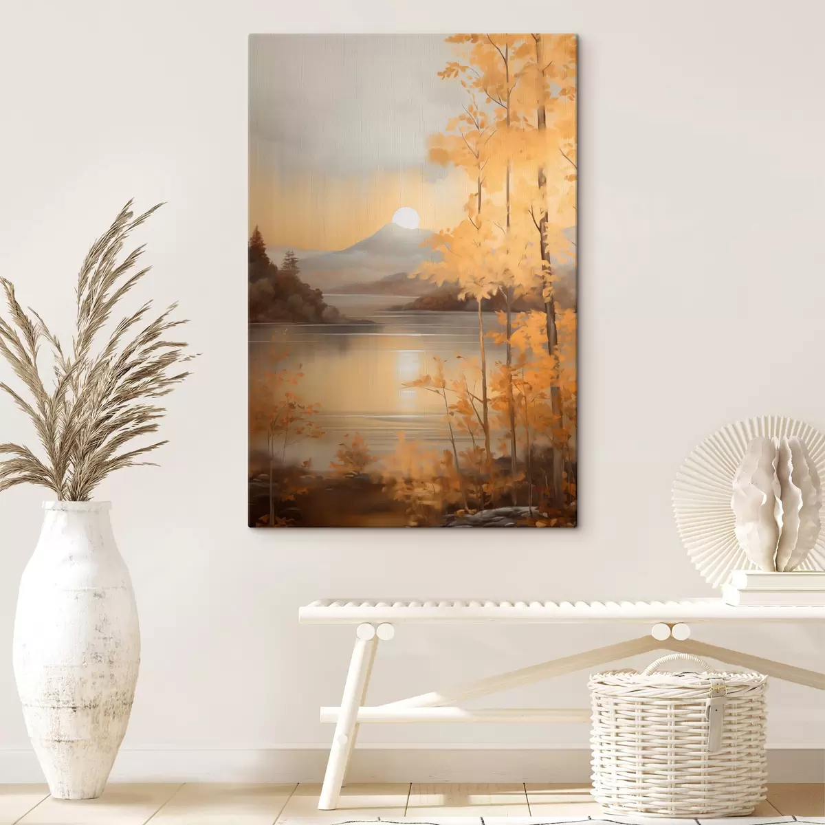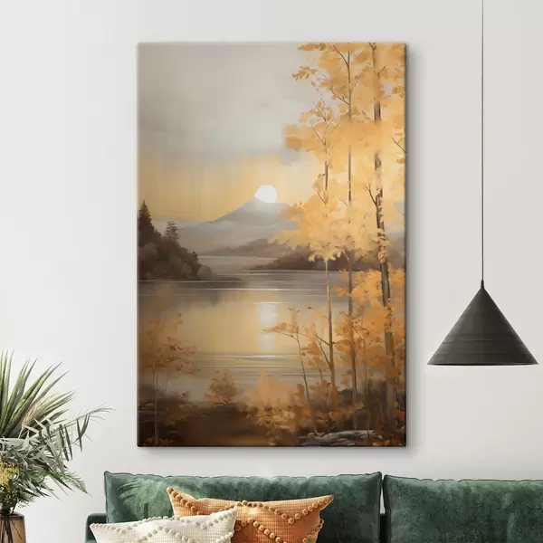 Quadri Alberi autunnali dalle foglie arancioni incorniciano un lago tranquillo con montagne lontane sotto un cielo nuvoloso. Nr s47440