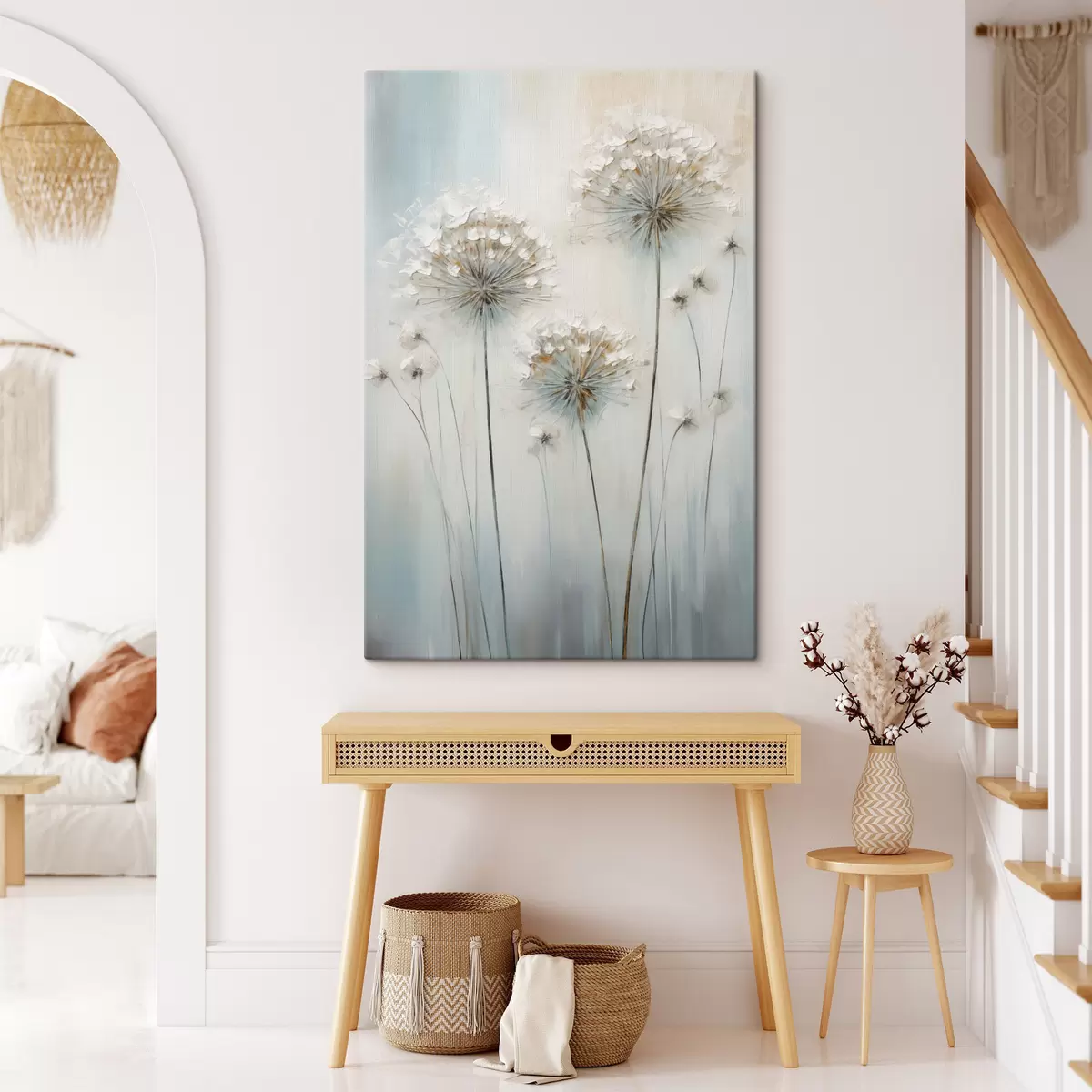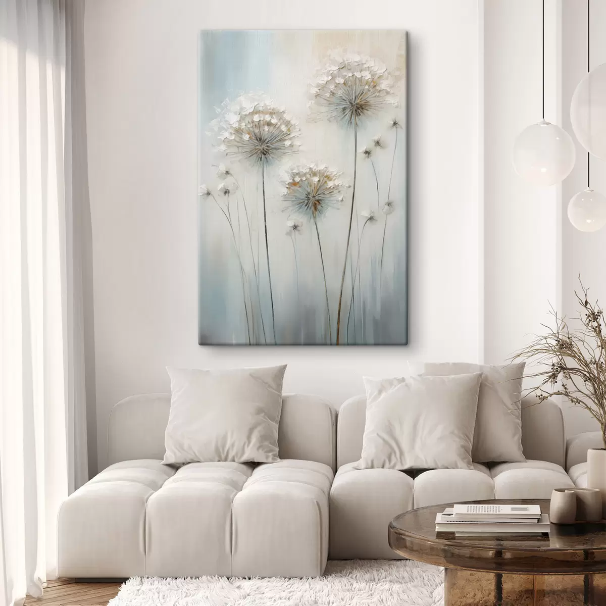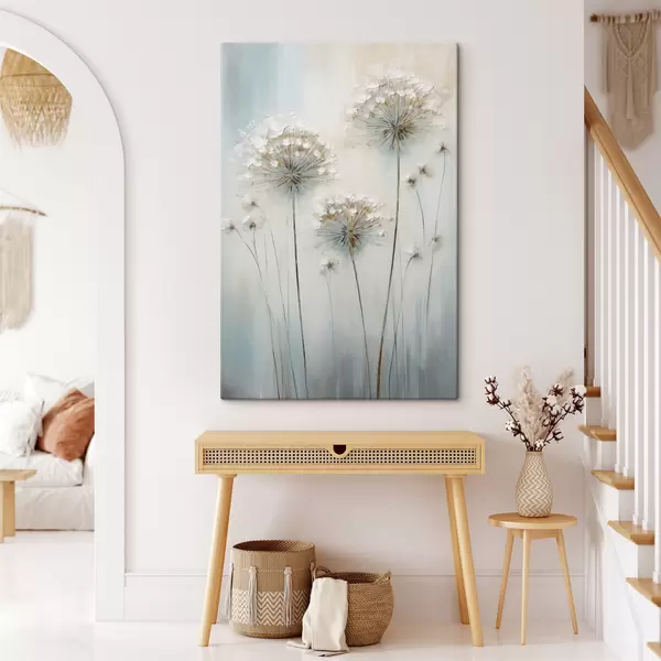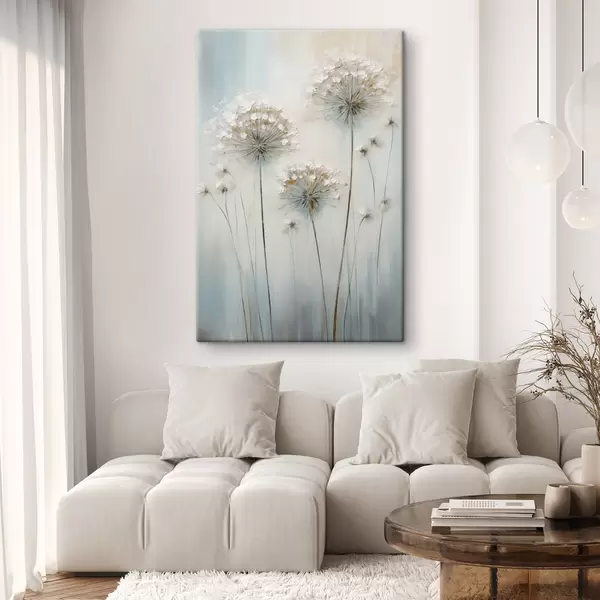 Quadri Stile pittorico materico di denti di leone su uno sfondo morbido blu e bianco Nr s47855