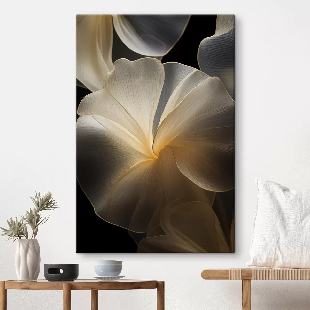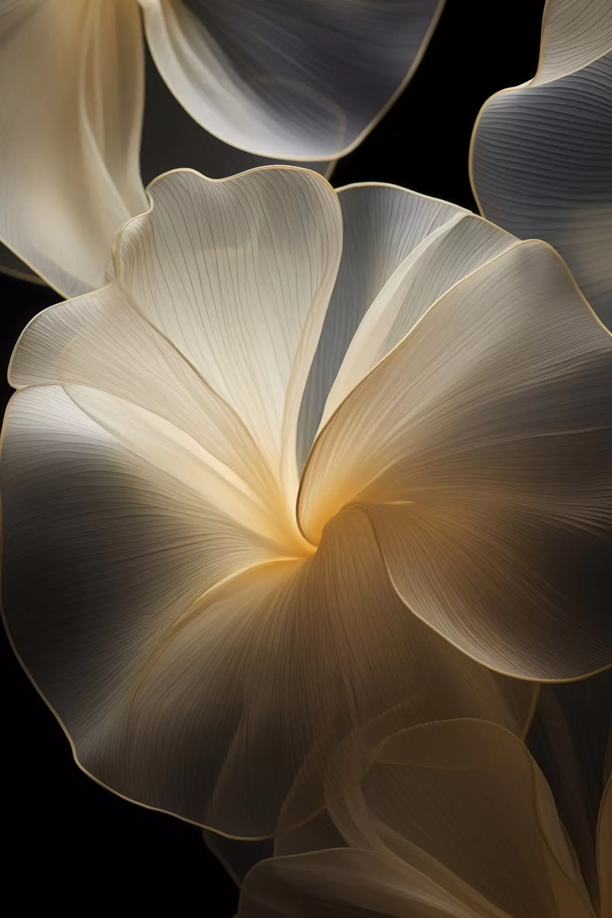 Quadri Petali astratti fluidi e traslucidi con linee delicate, su sfondo scuro Nr s47860