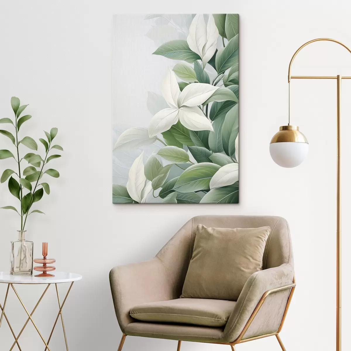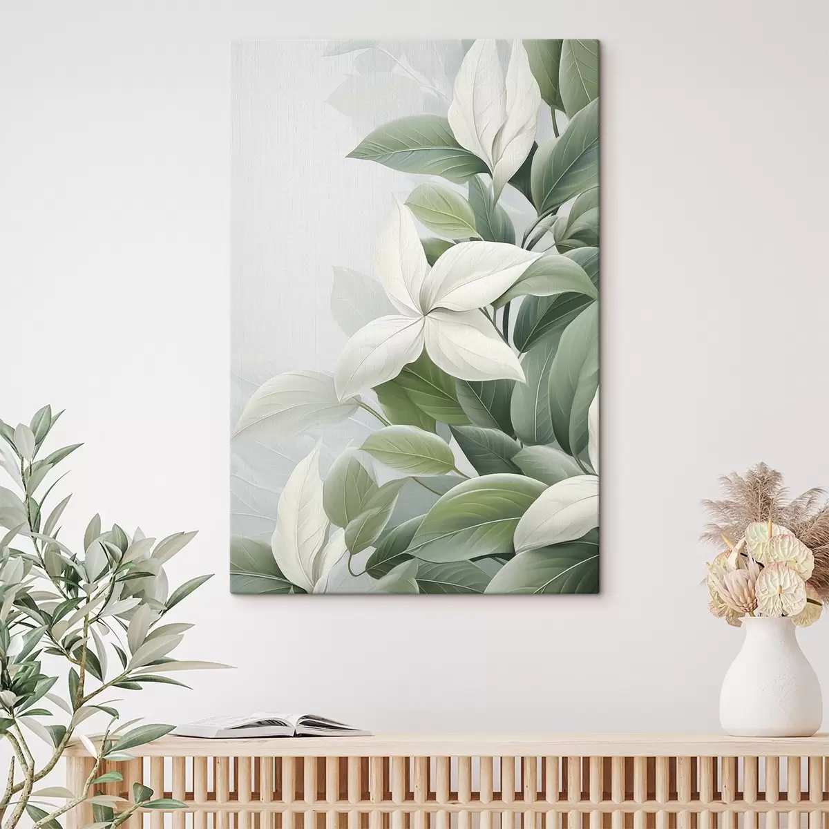 Quadri Fiori bianchi con foglie verdi, sfondo pastello Nr s47870