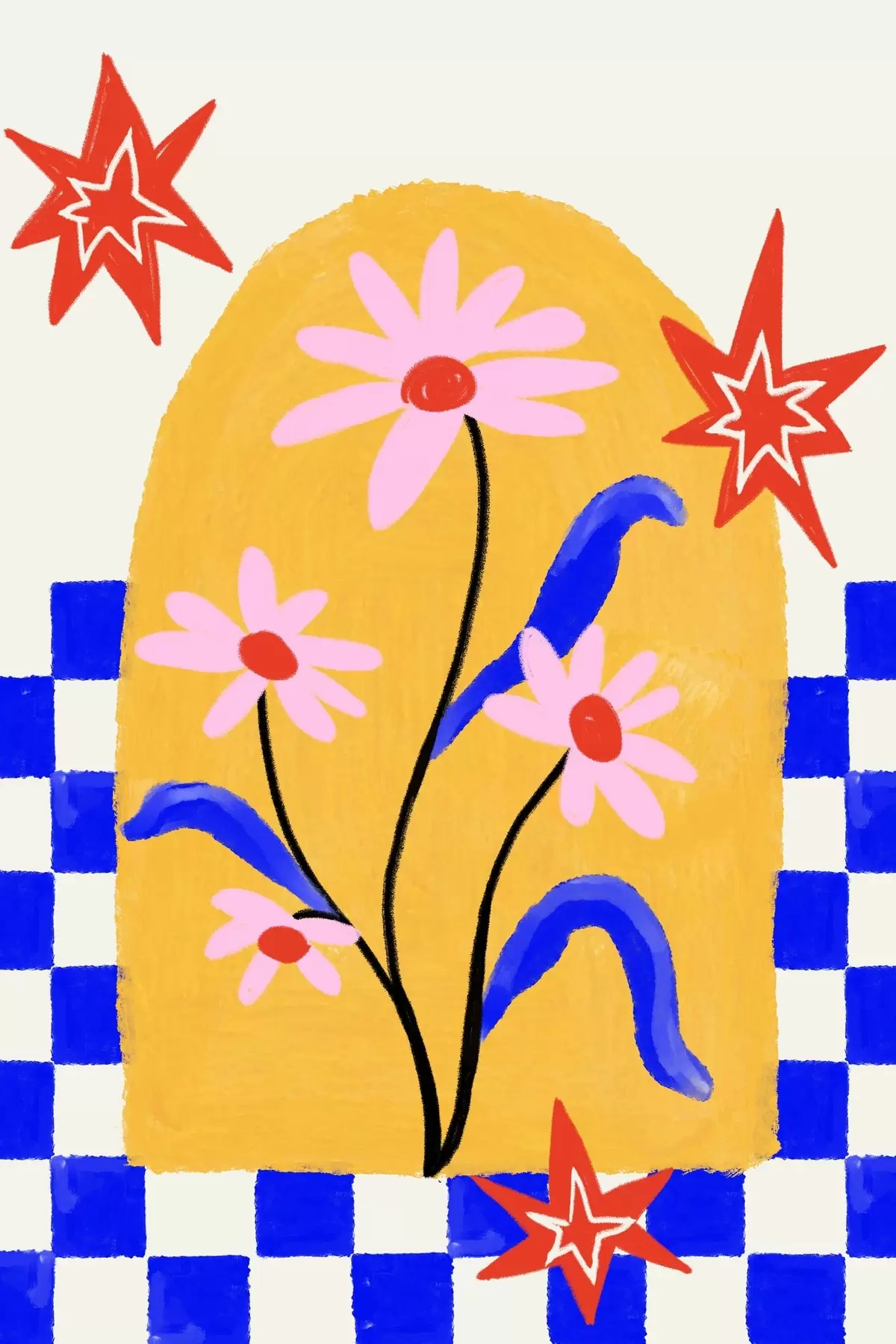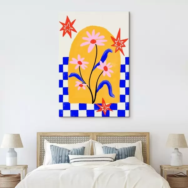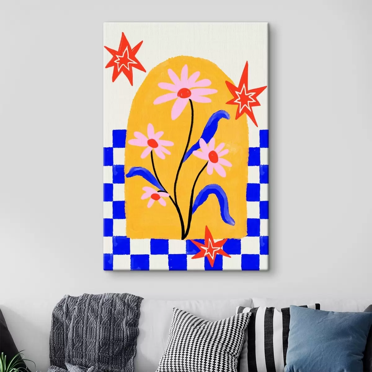 Quadri Fiori dai colori vivaci su sfondo giallo con motivi blu Nr s48034