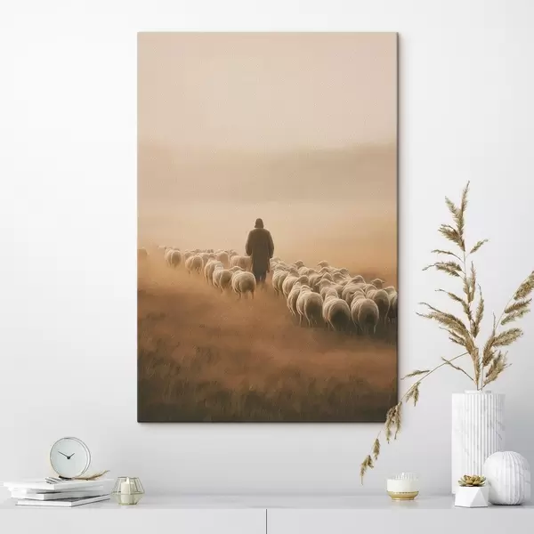 Quadri pastore che cammina con il gregge di pecore in un campo aperto Nr s48077
