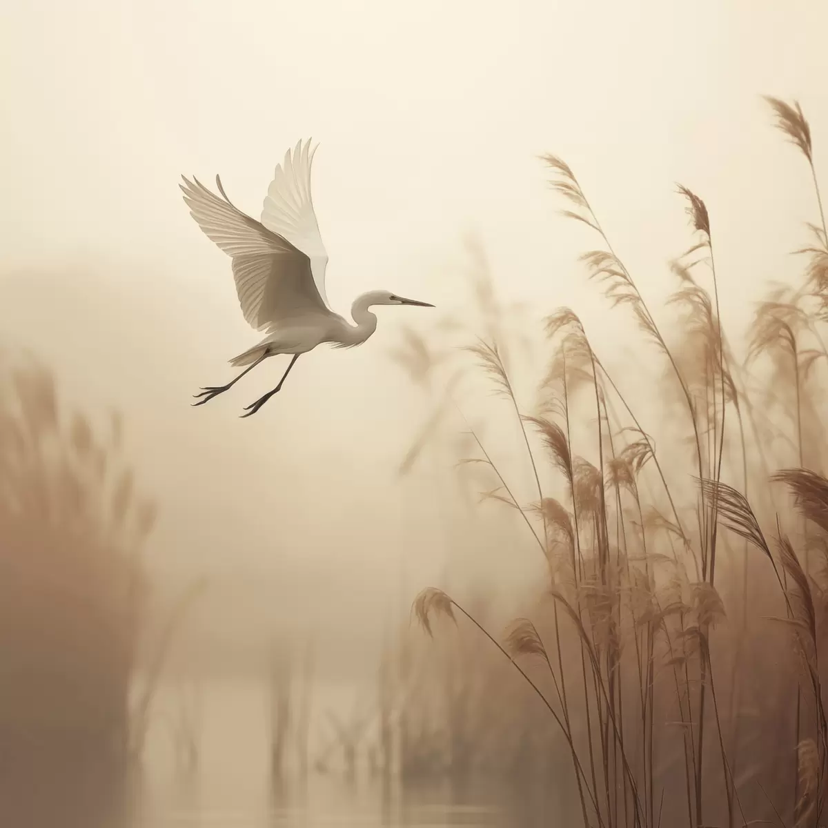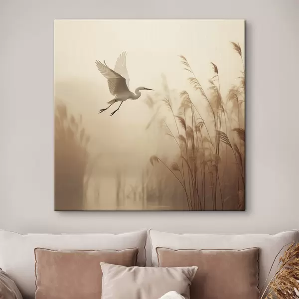 Quadri Un airone bianco vola sopra un lago, circondato da alti canneti e alberi sullo sfondo Nr s48390