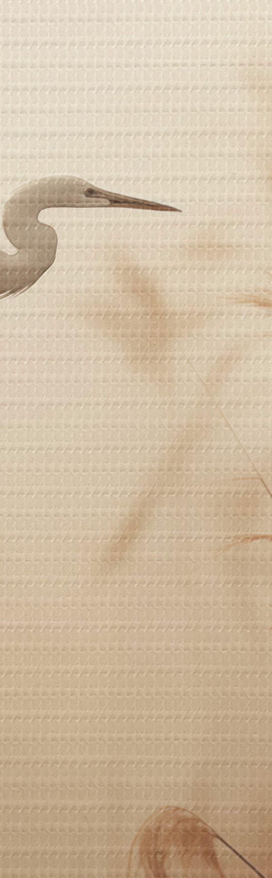 carta da parati Un airone bianco vola sopra un lago, circondato da alti canneti e alberi sullo sfondo nr. s48390