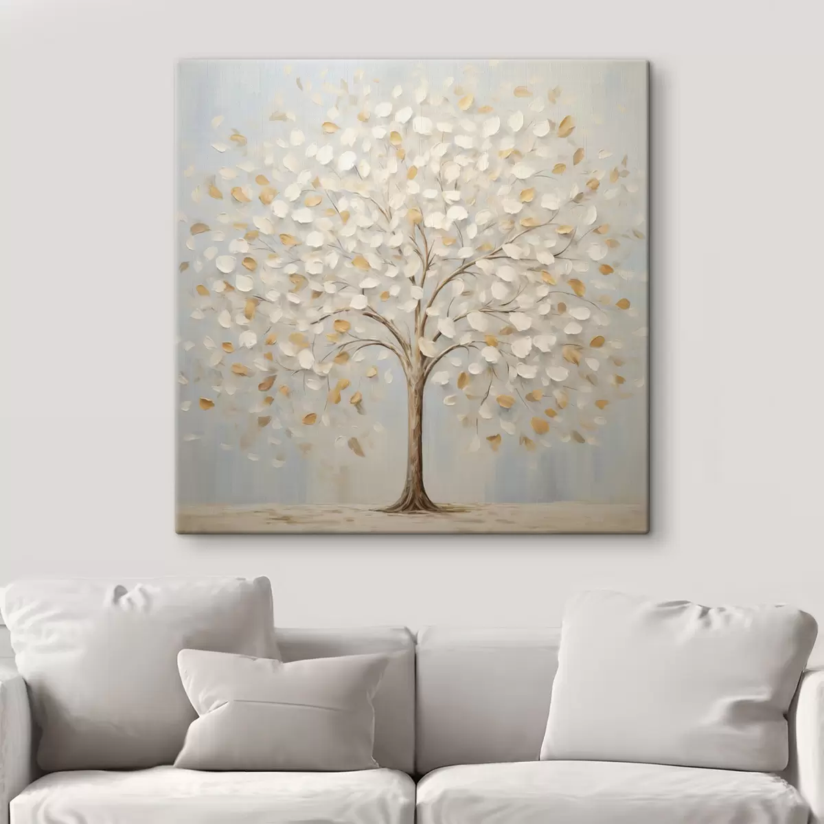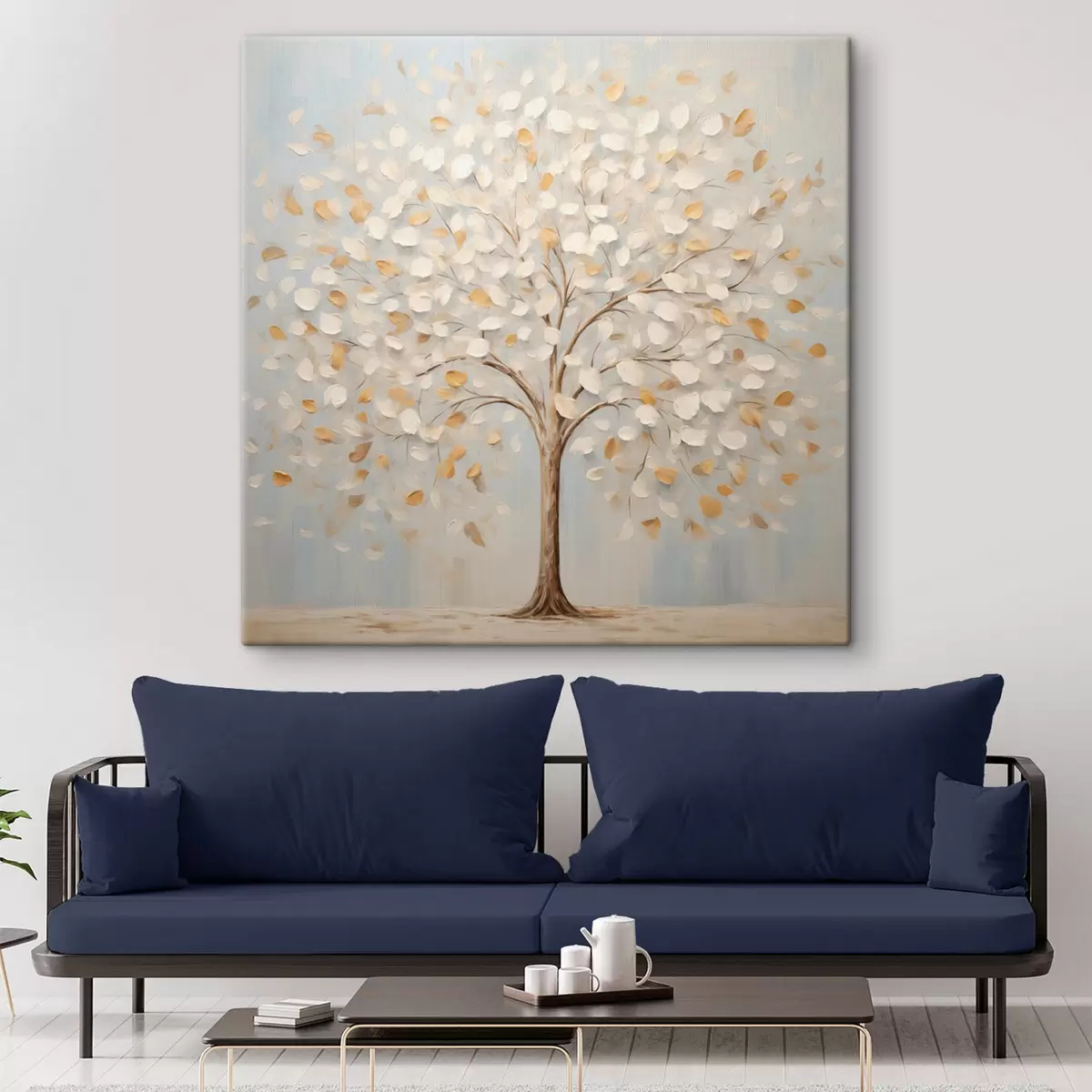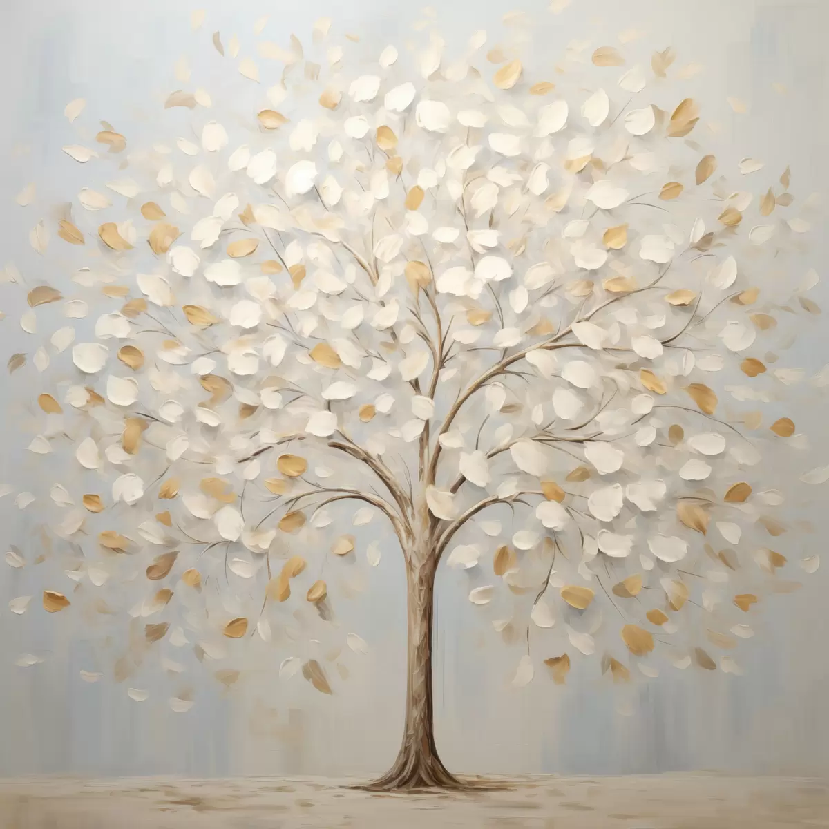 Quadri Un dipinto dal tratto materico raffigurante un albero con foglie bianche e gialle su uno sfondo azzurro Nr s48391