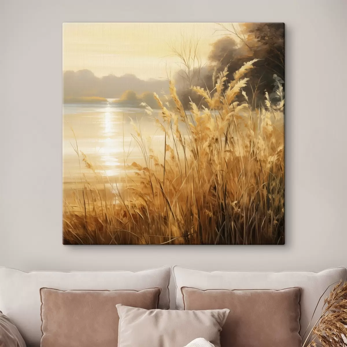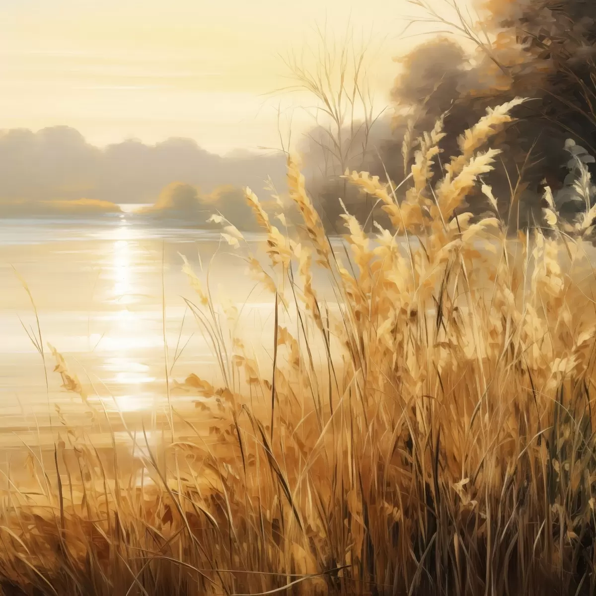 Quadri In primo piano, erba alta e secca con spighette; sullo sfondo, un lago e degli alberi Nr s48393