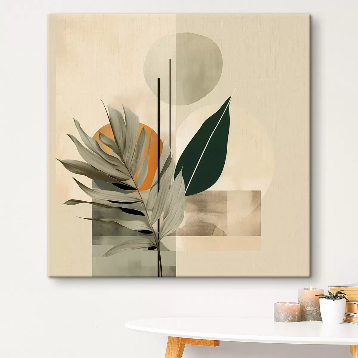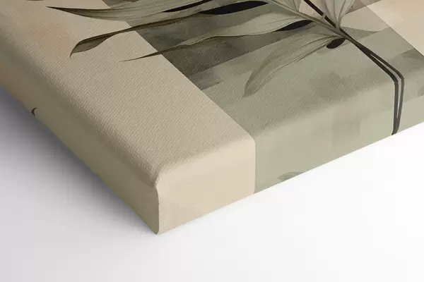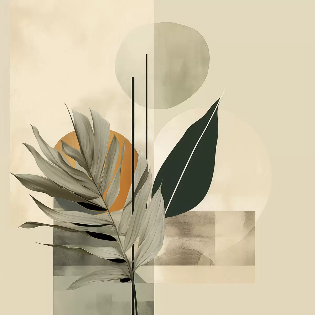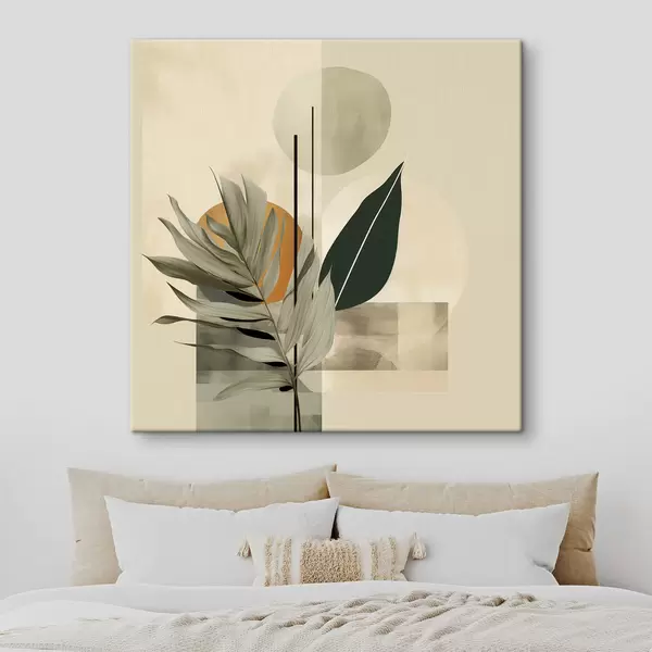 Quadri Una pianta di colore verde scuro con forme geometriche astratte e texture acquerellate nei toni del beige e del verde Nr s48410
